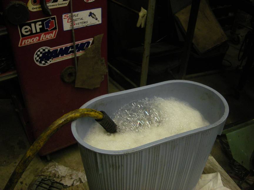 Pro's: it's very cheap and most important it cleans like a champ!. (IMG:style_emoticons/default/smilie_pokal.gif) It's amazing how well it works in all the nooks and crannies. Although it's slightly caustic it's no where near as nasty as most carb cleaning chemicals and it doesn't seem to hurt rubber parts like diaphragms. Nice fresh pine scent . Big safety plus it's Nonflammable! Con's: It does seem to react with cadmium plating, it doesn't seem to bother the Weber plated parts too much, but my Gene Berg DCNF stacks really reacted to it. Leaves a film on brass parts, remove them or you have to polish them afterwards, but it does not harm them. It smell's like pine, real strong, in fact it smells like the janitors room. If you have an attached garage I'd do it outside. You will get it on you and you will also smell Pine-Sol fresh, wear the gloves and some old clothes. Loses it's "oomph" after about 3 days, I got 3 carbs done. You must fully immerse the parts or it can leave a scum line. You really need a compressor to blow out the passages when done. No real rocket science here, I got the Pine-Sol and mixed it 2 parts Pine Sol to 1 part water. I used 4 liters (quarts) of pinesol. I found that this plastic waste basket was just the perfect size for the IDA /6 carbs. I had a handful of latex gloves, a couple of toothbrushes, some tools, compressor, a table and a bag of rags. You must throughly rinse with water and dry (blow out) the carbs when done. Attached image(s)
