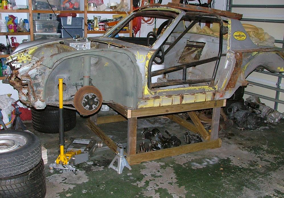 This car has a lot of value to me and I see myself as a caretaker. So it will get used in appropriate events but not abused nor will it be locked away in my motor racing heritage museum (i.e. my garage). Wouldn't it be cool if a couple regular guys (like the original owners were) could build still build a car and compete in the ALMS/IMSA with the big boys, which is what this car represents. I think for a lot of closet racers, this is a common dream. My plan is to make it look like it did when it ran Sebring, Daytona, etc. on the outside but with the rust repaired, new components that would not have been out of place in the late 70s, and safer than it was. So it will get the same exact paint scheme, same type of fiberglass flares, I will repair the original front bumper, repair the fiberglass roof, use the original fuse and switch panel, use the custom made oil tank, use a GT style front oil cooler like they had, use Gotti wheels like they did, keep the original roll cage, original tranny cooler and pump, 2 fuel pumps, 2 ignition set ups, etc. No carbon fiber. Whereever I can keep the original parts I will, and where I can't I will get similar new or used parts. I do plan to make it safer so I will use braided fuel lines, etc. but am looking for nickel plated fittings rather than blue and red aeroquip fittings, which they had only a few of. It is interesting how many companies are still in business that made parts in the 1970s, like Koni, ATL, mocal, holley, bilstein, bosch, etc. I could have kept it exactly as I got it, but it would only be a rusty paperweight then, not a living, running car. I plan to bring the car back to life without over doing it, or using stuff they never had, unless for safety. I was also thinking we are only seeing what it looks like 30 years after they quit racing it. Who knows when the front end crash happened that removed so much of the original metal and caused a lot of rust to happen. It was run in SCCA racing after the original builders sold it (they moved on to 911s). Sorry for the long ramble, I am actually trying to keep this fun. Today my buddy Sean (the Prawn) was over and we built a stand to get the car off the ground so we could remove the suspension and repair the front end damage. You can see how little was left of the front of the car. A couple world members are helping me out with parts cut from wrecked cars that I will post when they get here. Getting some serious help from Chris Foley, which is hugely appreciated. John |