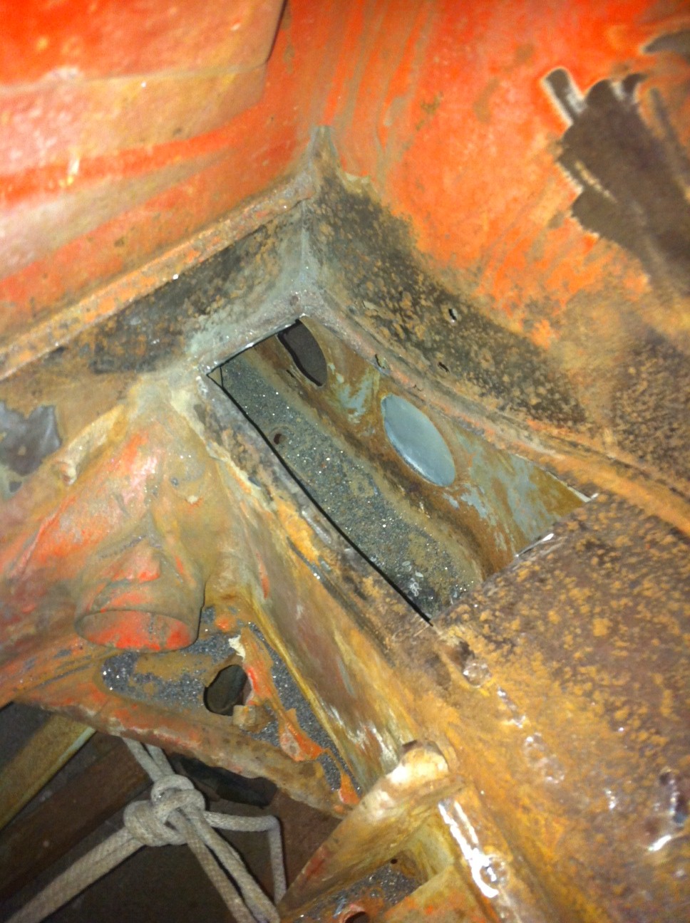 I cut out a small part of the frame at the hellhole since it was pitted pretty badly. Found the remains of a mouse house in there, but the frame itself looks pretty good for a 40 year old car. I was just sandblasting the hellhole a bit so it still has the sand all over the place... |