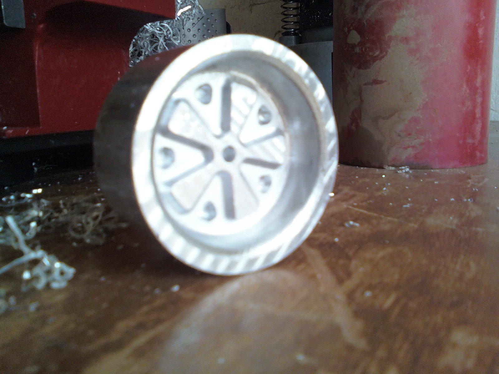 link to purchase please let PM me if there are problems with the store... -Jim PS: Final version picture: (IMG:http://www.914world.com/bbs2/uploads_offsite/www.smalltowngeek.net-8112-1333930199.1.jpg) I now have two cars here, and I've got the measurements! I am ready to start cutting out the wheels. It will be easiest to do them if I do a larger run. The process for cutting out the wheels requires me to set up my CNC mill in multiple configurations. 26 or 31mm widths. The tires these are designed for are the HPI vintage tires. If you'd like to run a different set, PM me or post here. Here are a couple of teaser pics. The chunk missing was a glitch in the code, but has been resolved in the PC simulations. Attached image(s)