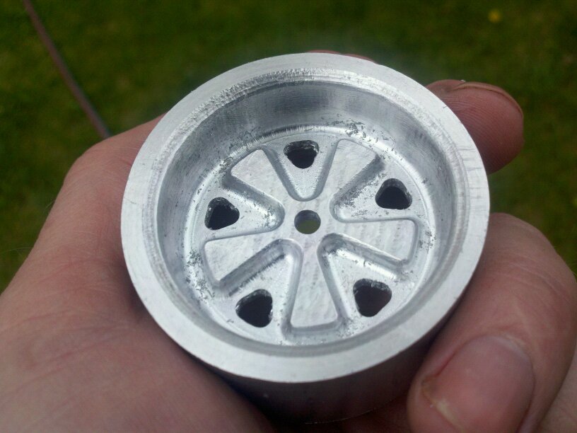 link to purchase please let PM me if there are problems with the store... -Jim PS: Final version picture: (IMG:http://www.914world.com/bbs2/uploads_offsite/www.smalltowngeek.net-8112-1333930199.1.jpg) I now have two cars here, and I've got the measurements! I am ready to start cutting out the wheels. It will be easiest to do them if I do a larger run. The process for cutting out the wheels requires me to set up my CNC mill in multiple configurations. 26 or 31mm widths. The tires these are designed for are the HPI vintage tires. If you'd like to run a different set, PM me or post here. Here are a couple of teaser pics. The chunk missing was a glitch in the code, but has been resolved in the PC simulations. Attached image(s)