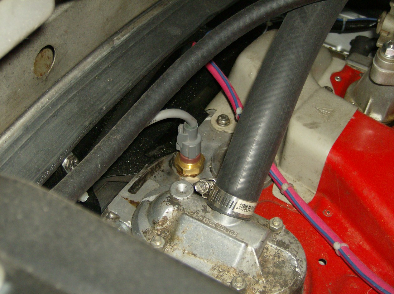 Honda Civic/Accord/etc. radiator fan switch from Autozone, $20. Wells part number TU197 with 18 x 1.5 metric thread. Turns on at roughly 93 deg C. Off somewhere around 89 deg C. Pigtail for same radiator switch from the local pic and pull, $1.50 The switch threads into where the idiot light was situated. I used the adapter that was in this spot for the combo oil pressure/idiot light switch now mounted next to the fan. |