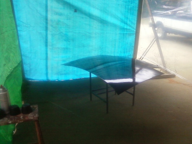 Well, we set up a temporary paint area to keep the wind out, and finally got the paint even, but I still made a spot on the front that will have to be sanded and painted again...