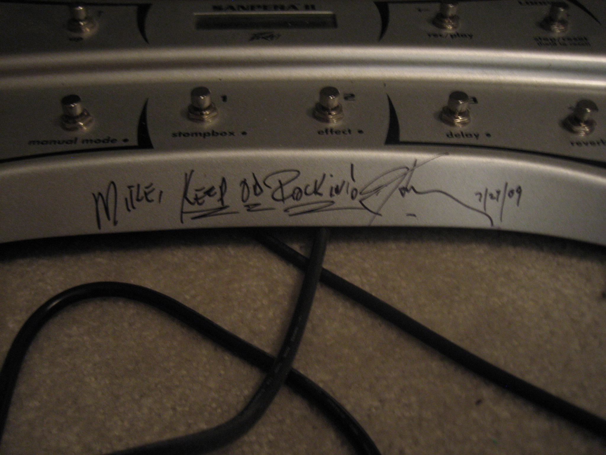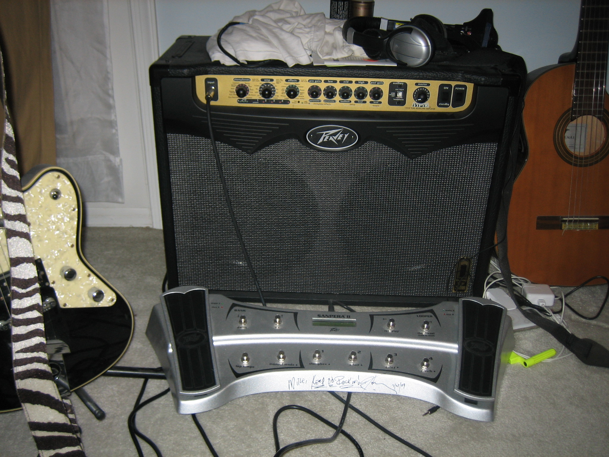 Not pictured is my cheapo Yamaha 6 acoustic that I have traveled the world with. It worked better than a passport in Russia where I played an impromptu gig on stage at a huge club with it (IMG:style_emoticons/default/smile.gif) Also not pictured is my Simmons electronic drum set. My guitar amp is a Peavey Vypyr 120 tube amp with built in modulation and the Sanpera foot board. Pedal boards is personally autographed, to me, by the man himself, Heartly Peavey (IMG:style_emoticons/default/smile.gif) Attached thumbnail(s) |