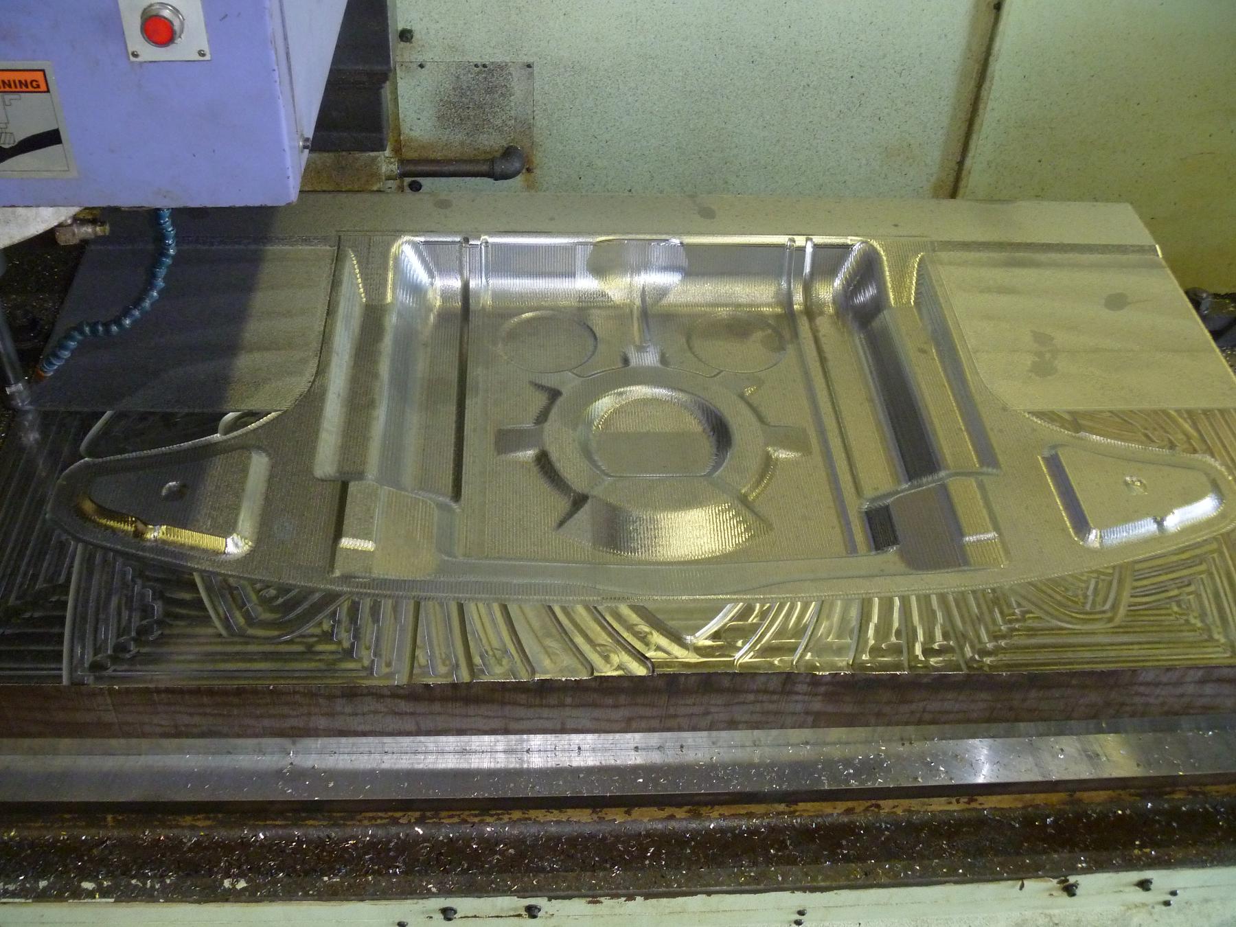 Over the weekend I got some more milling done. The center has been gone over with a 1.25" ballnose, and will still need to be finished with a .375" ballnose to be able to reach all the tight radiuses. In the photo it is finishing the flatter areas outside of the pocket, so that I dont have to run over it with another cutter which would just be wasting time. |