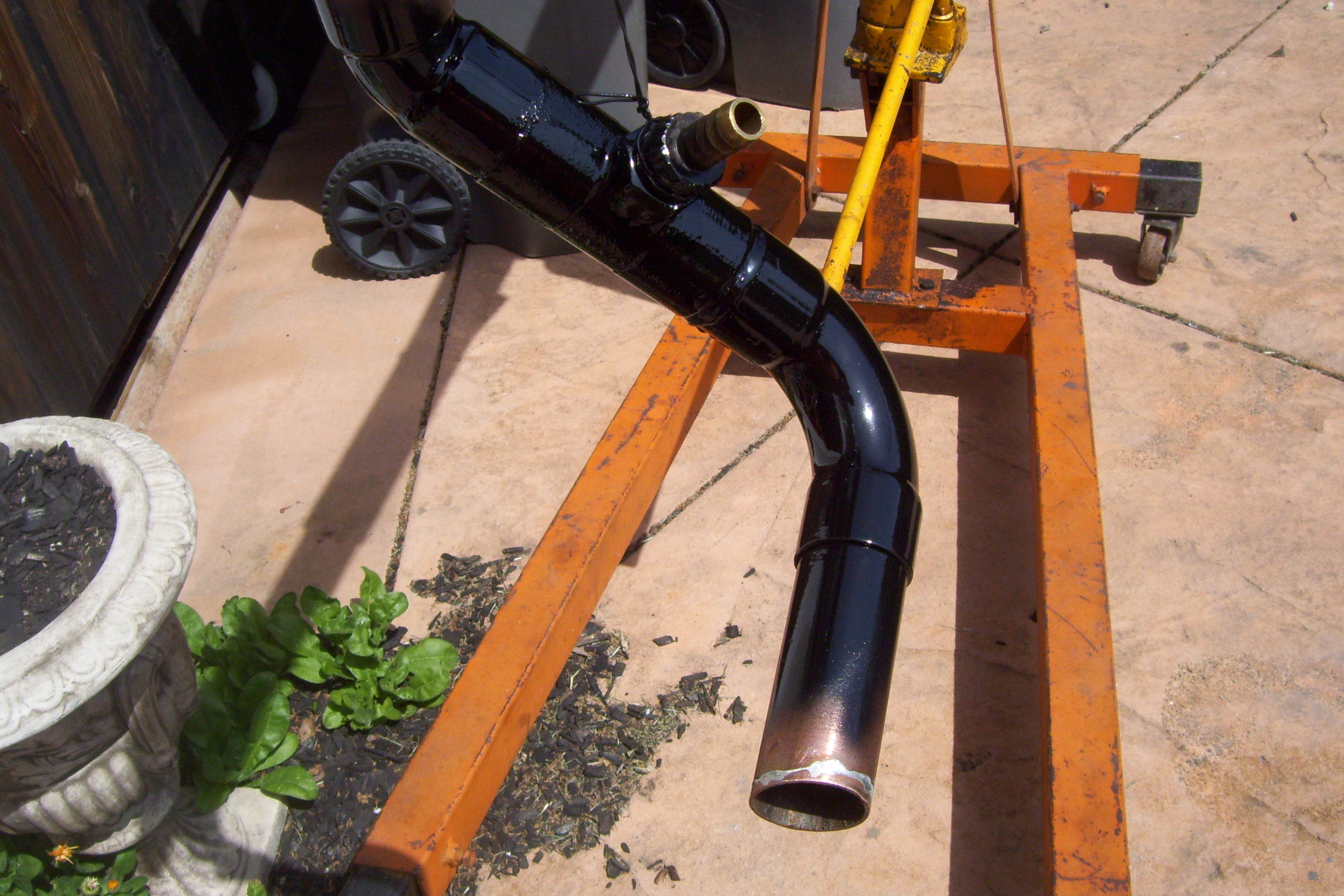 Didn't have as time today due to the holliday. Here's a better pic of the copper transition piece I made. The T is brass with a threaded bung. The 1/2 nipple goes to the heater in the fresh air box. |