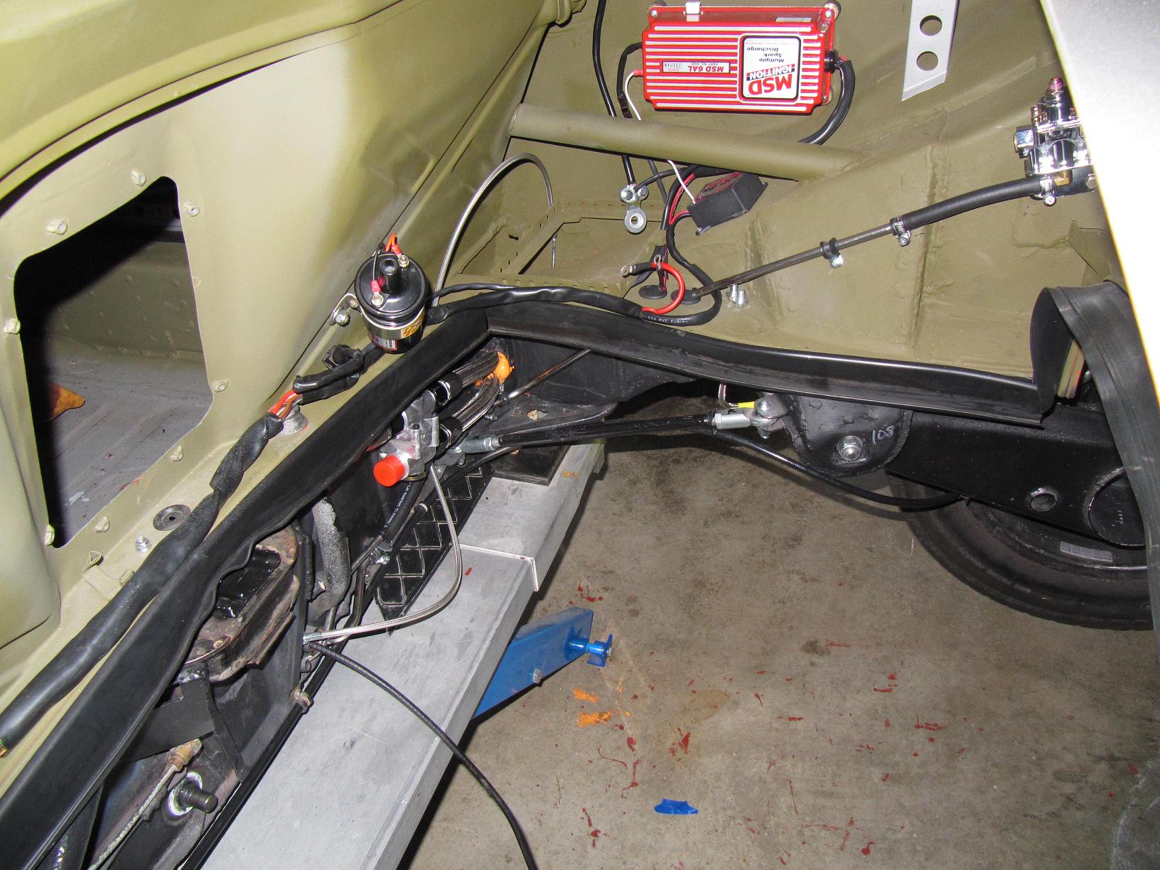Here is the right side detail. with my home grown battery tray....wait till you see my "hot rod' style battery hold down. All the ignition components are wired into the body harness.