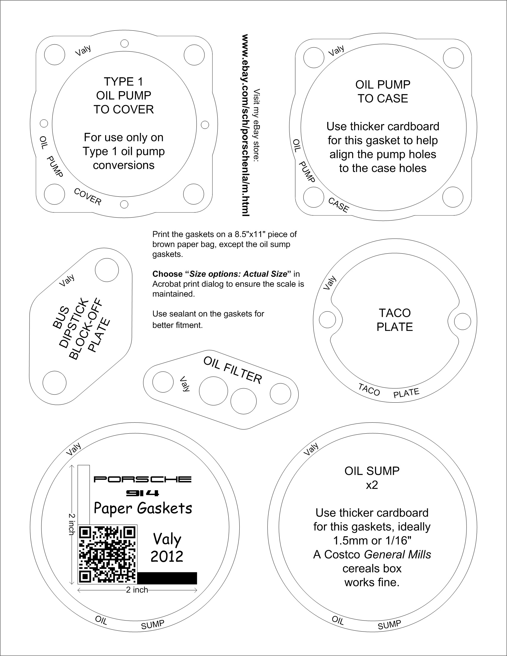 I had to make a thicker gasket for my oil pump to align it better with the case oil galleys. I also had to make a gasket for my Bus dipstick block-off plate (I have a universal replacement case) I had an old template for the oil sump gaskets on hand as well so I decided to combine all of them in one template and add the remaining gaskets as well. A brown paper bag works perfectly for the thin gaskets. For the thicker ones, I used a cereals box. The Costco one was better since the cardboard is a bit thicker as the box is bigger. Always use sealant on the gaskets for better fit. I recommend to use the PDF version for better print scaling. |