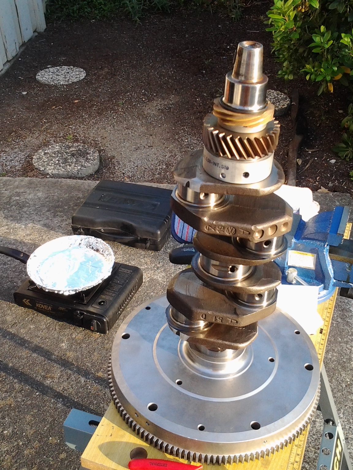 I re-built the crankshaft assembly. The crank is a 2.0L 71mm STD crank. It was polished and balanced together with the fan, flywheel and clutch. I used the flywheel as a stand and fixed the crank into it in vertical position. I gave it a good cleaning, including inside all the oiling passages. I heated the camshaft and dizzy gears on a small camping stove I had nearby and then mounted them on the crank. The big c-clip was a PITA to fit but I finally got it in there. |
