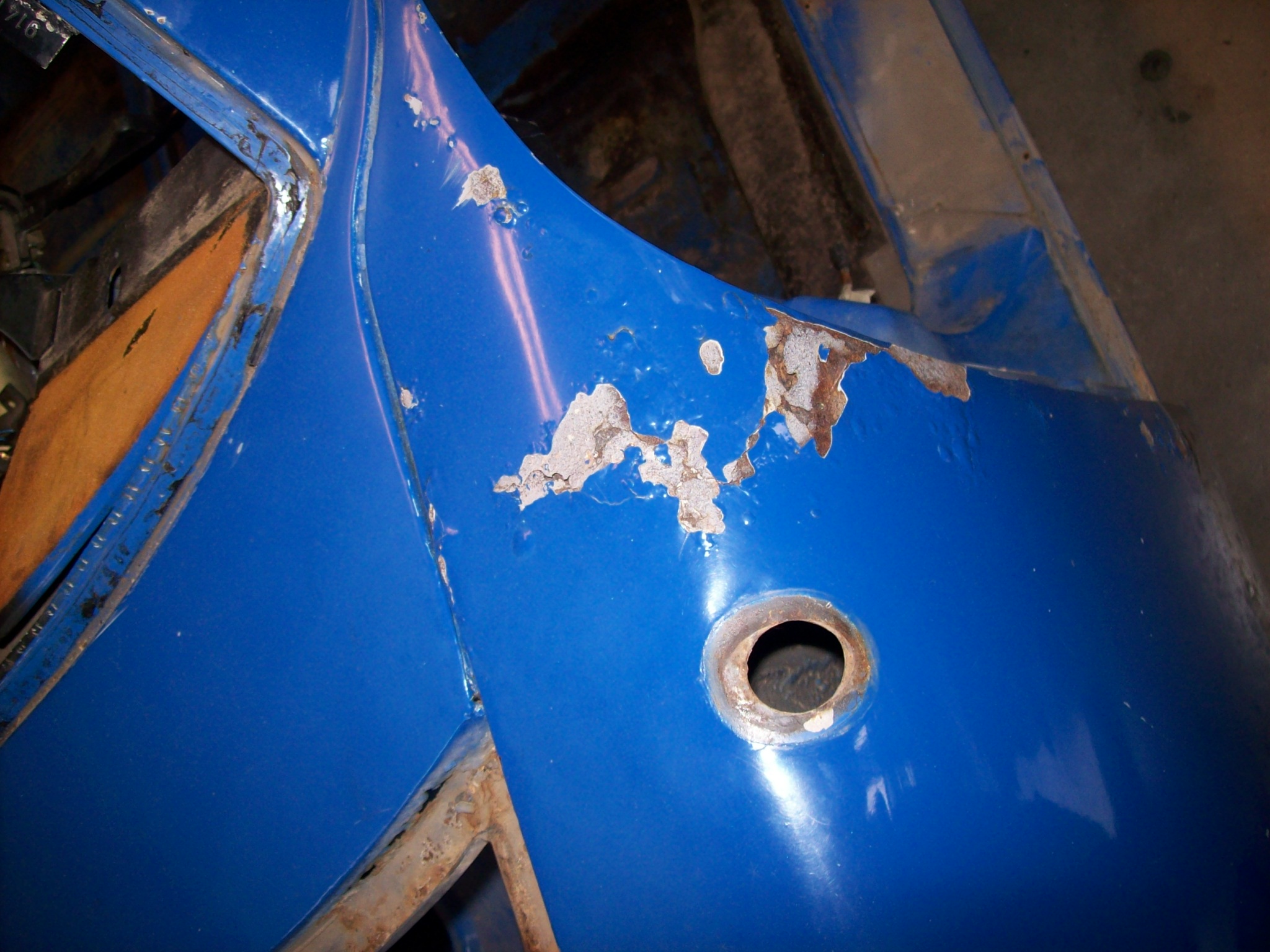 New to the board. Most of my work and experience is over on Pelican with 911 longhoods. I stalked a local PCA guy who was going to eventually sell his 914-6. No pressure, just every few months I let him know I hadn't forgotten. Finally got a chance to see the car in person three weeks ago. Passenger rocker issues as well as surface bubbling in a number of places. Car had been extensively autocrossed at PCA parades for years...very successfully. Owner had pulled the original 2.0 and replaced with a 2.7 RS spec engine with carbs. He bought another mid-engined car (boxster) and ignored the 6. I bought the car (w/ 2.7) and original engine. Got the 2.7 running well enough to drive the car...and decided to dive into the resto. I am familiar with rust, and plan to do it correctly. I have a rotisserie with 911 mounts, but shouldn't be a big deal to make mounts for the 6. Made a couple calls to Resto Design to check on parts...and away I go. I have a 71 911 softie that has been at paint too long...so while I wait for it to come home, thought I would see what my sandblasters schedule was. Turns out he can do the car in two weeks. So, I have a deadline. So...I guess this is my resto thread on my new Adriatic Blue 6...