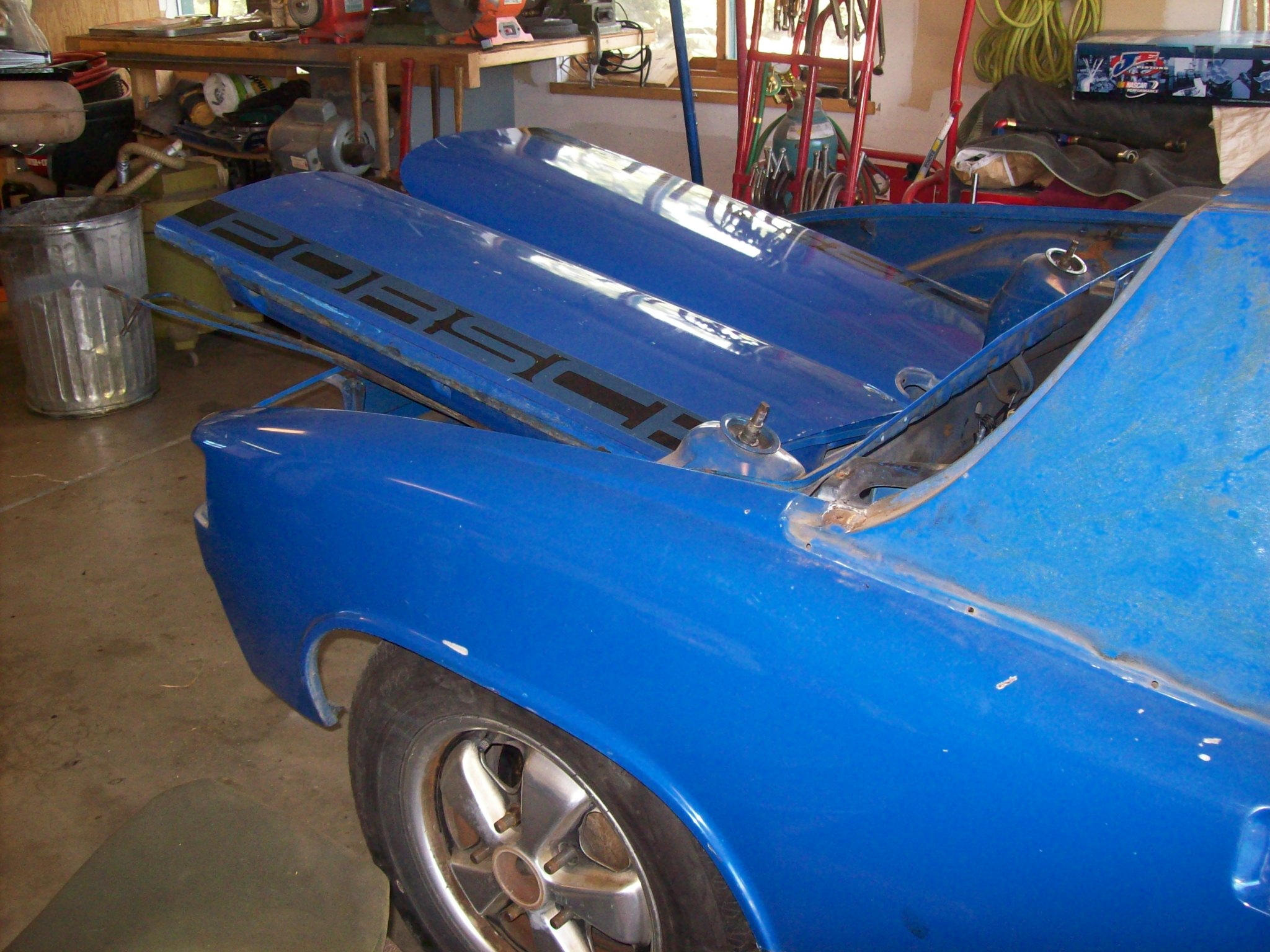 New to the board. Most of my work and experience is over on Pelican with 911 longhoods. I stalked a local PCA guy who was going to eventually sell his 914-6. No pressure, just every few months I let him know I hadn't forgotten. Finally got a chance to see the car in person three weeks ago. Passenger rocker issues as well as surface bubbling in a number of places. Car had been extensively autocrossed at PCA parades for years...very successfully. Owner had pulled the original 2.0 and replaced with a 2.7 RS spec engine with carbs. He bought another mid-engined car (boxster) and ignored the 6. I bought the car (w/ 2.7) and original engine. Got the 2.7 running well enough to drive the car...and decided to dive into the resto. I am familiar with rust, and plan to do it correctly. I have a rotisserie with 911 mounts, but shouldn't be a big deal to make mounts for the 6. Made a couple calls to Resto Design to check on parts...and away I go. I have a 71 911 softie that has been at paint too long...so while I wait for it to come home, thought I would see what my sandblasters schedule was. Turns out he can do the car in two weeks. So, I have a deadline. So...I guess this is my resto thread on my new Adriatic Blue 6...