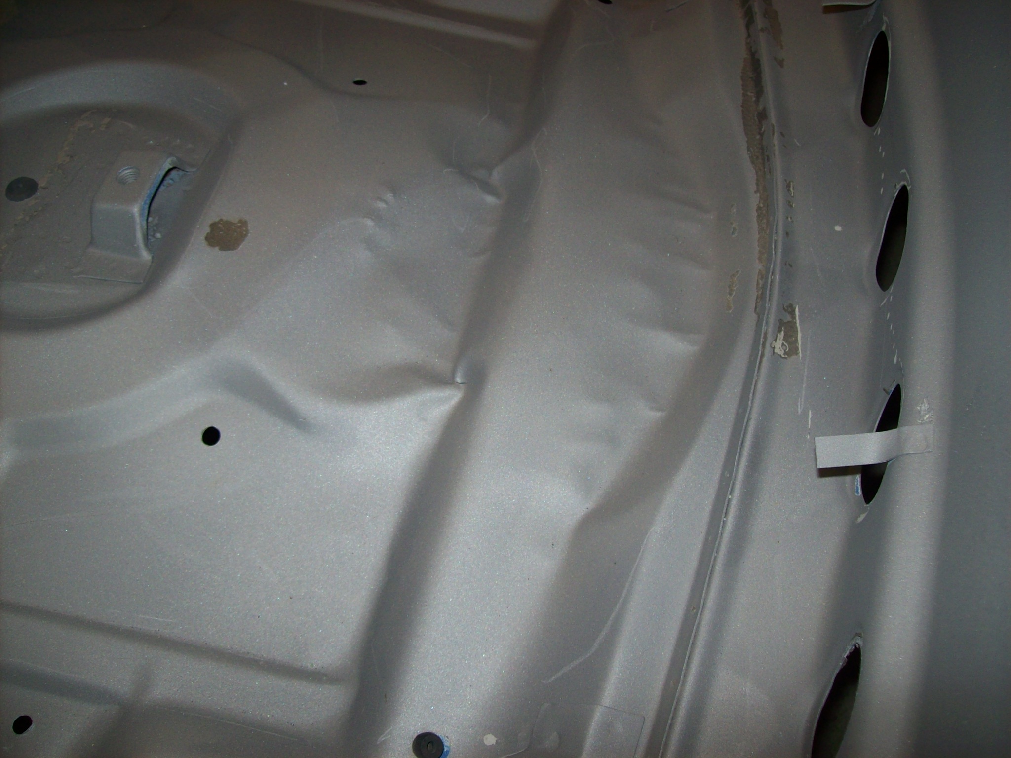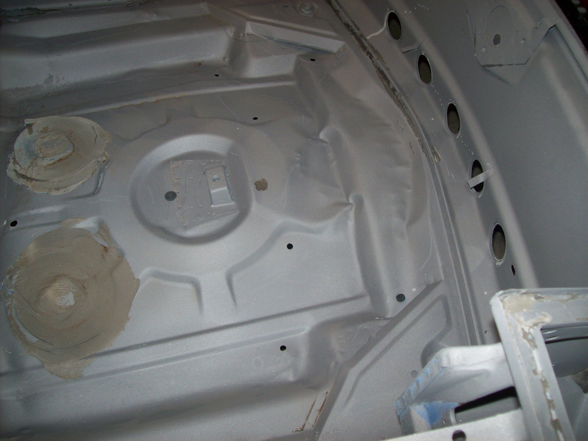 I needed to massage a few front trunk areas while the car was still supported by it's suspension. This area is solid, but beat up. Like it was seriously offroaded. The PO did a lot of autox in his day...but the cones he hit must have been made out of wood. Take a look