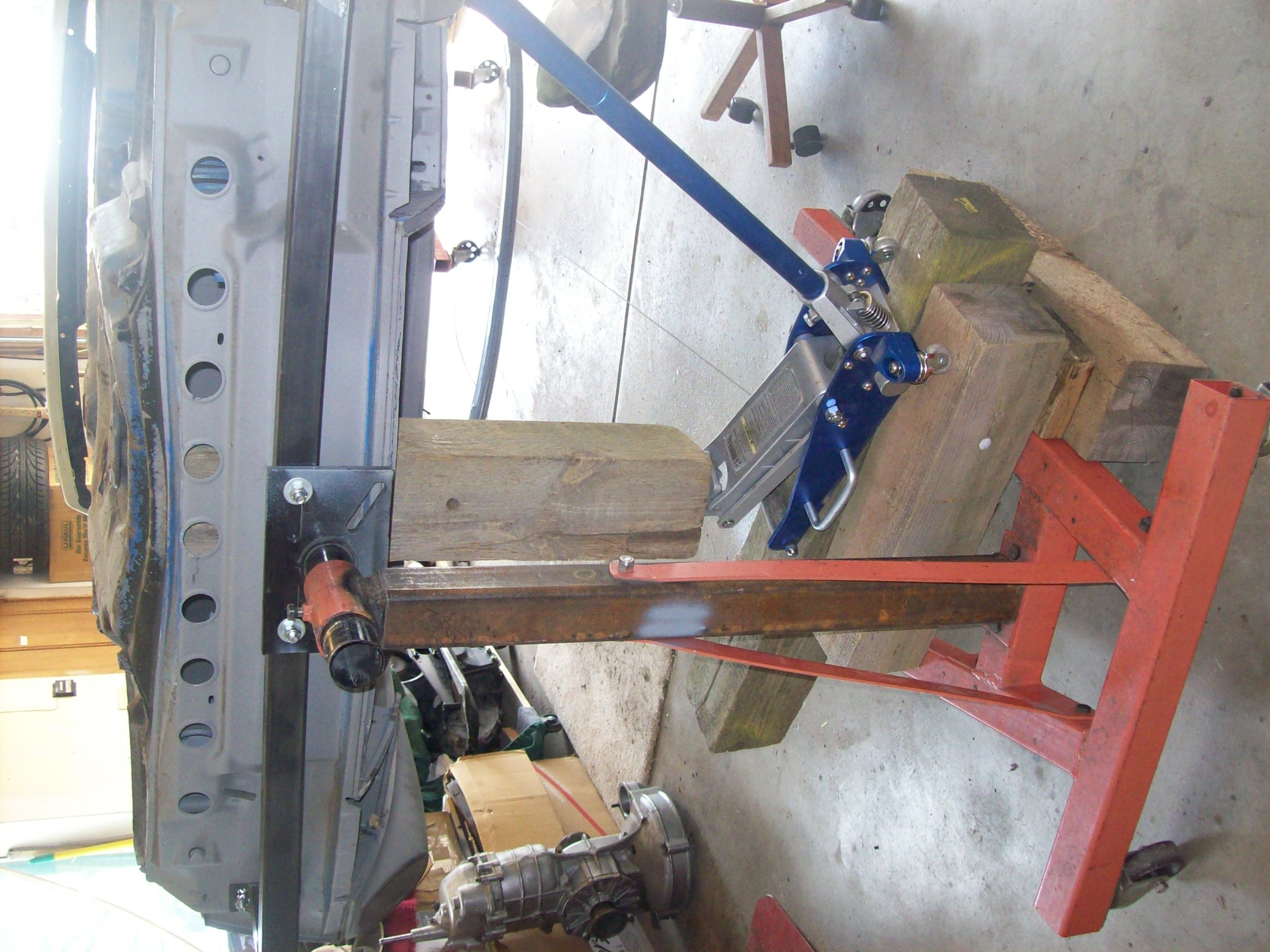 I needed to beat on something this weekend. As it has been suggested (by people far smarter than me)...that the front pan is beyond repair, I decided to tackle it. My first problem was how to create a bucking block. No sense in pushing or hammering awy at the pan without something behind , or on the other side of the force. With the floor jack on the concrete pushing up on the pan using a 6x6, all I accomplished was to lift both the car and the rotisserie up into the air. Not exactly what I wanted to accomplish. So my plan B was to create a platform across the two legs of the rotisserie on which I could place the jack. Now as I force the 6x6 pole up into the floor pan...either the car was going to give (floor pan move), or the rotisserie was going to explode. Fortunately the former happened. Here was my rig...sorry, couldn't get the pic to stay rightside up.