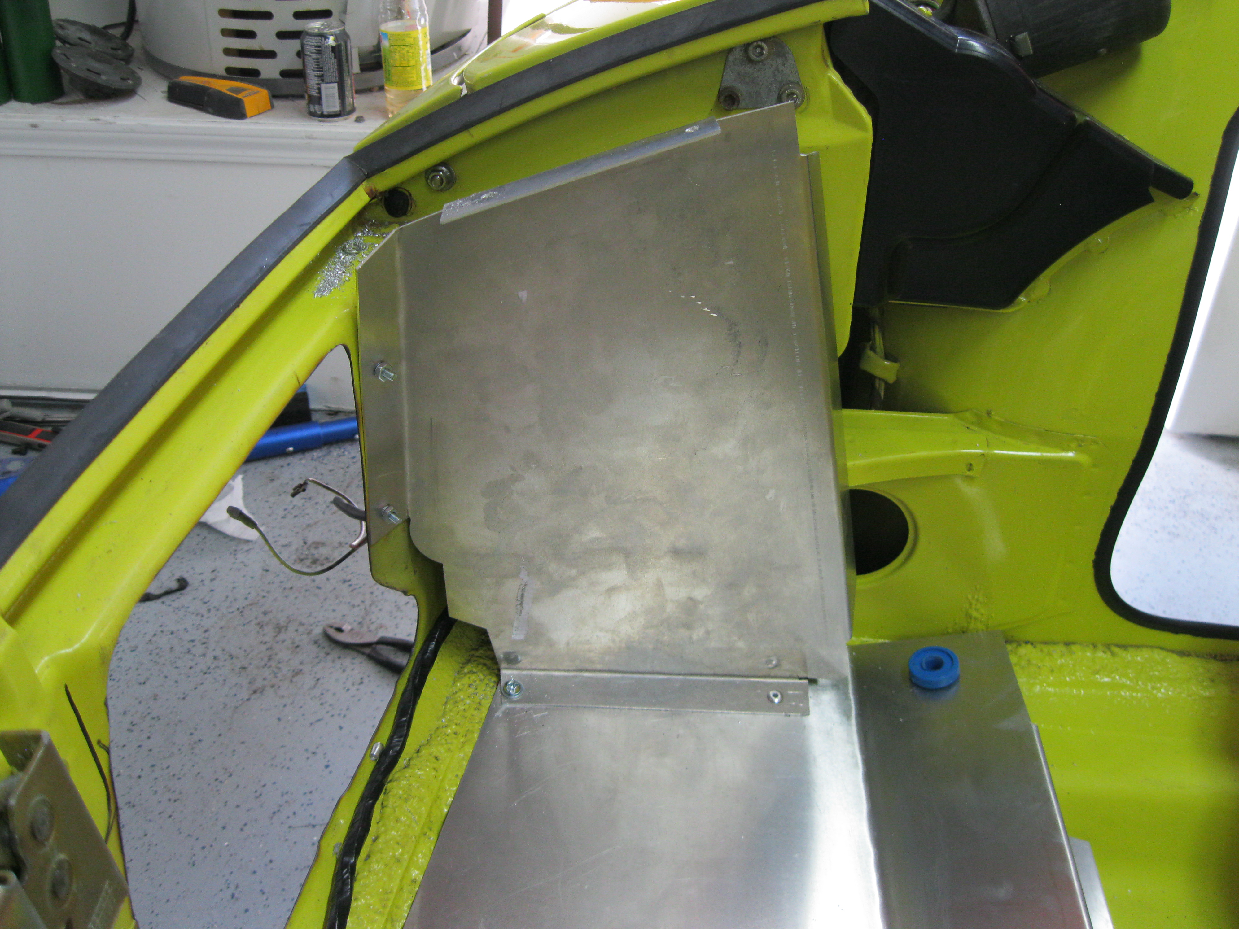 I kept the battery in the stock location and ran a 10-gauge wire up front for power. It seems that the dual fans spike the current draw at right around 40 amps when they kick in (somewhat less when they're running), so you'll want about 50-60 amps' worth of fuse protection. I had a 40-amp fuse in there for quite a while, but it ultimately blew, so that seems to be the threshold. The Spal fans are pretty quiet for the amount of air they move! Here's a couple pics showing the aluminum trunk floor, some of the side shrouding, the grommets (blue) and the re-routed wiring harness. Attached thumbnail(s) |