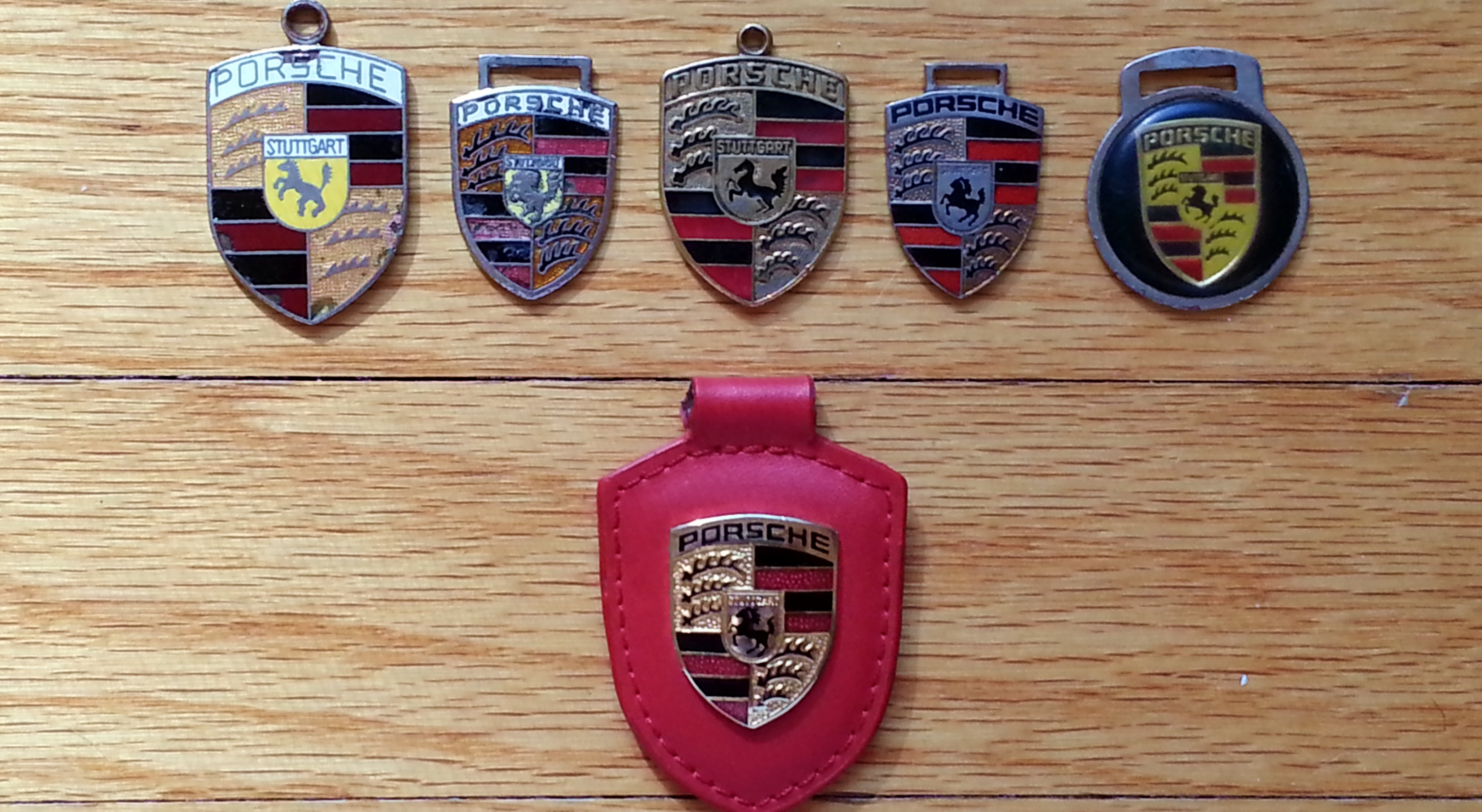 Vintage Porsche key chain shields. And one new one.