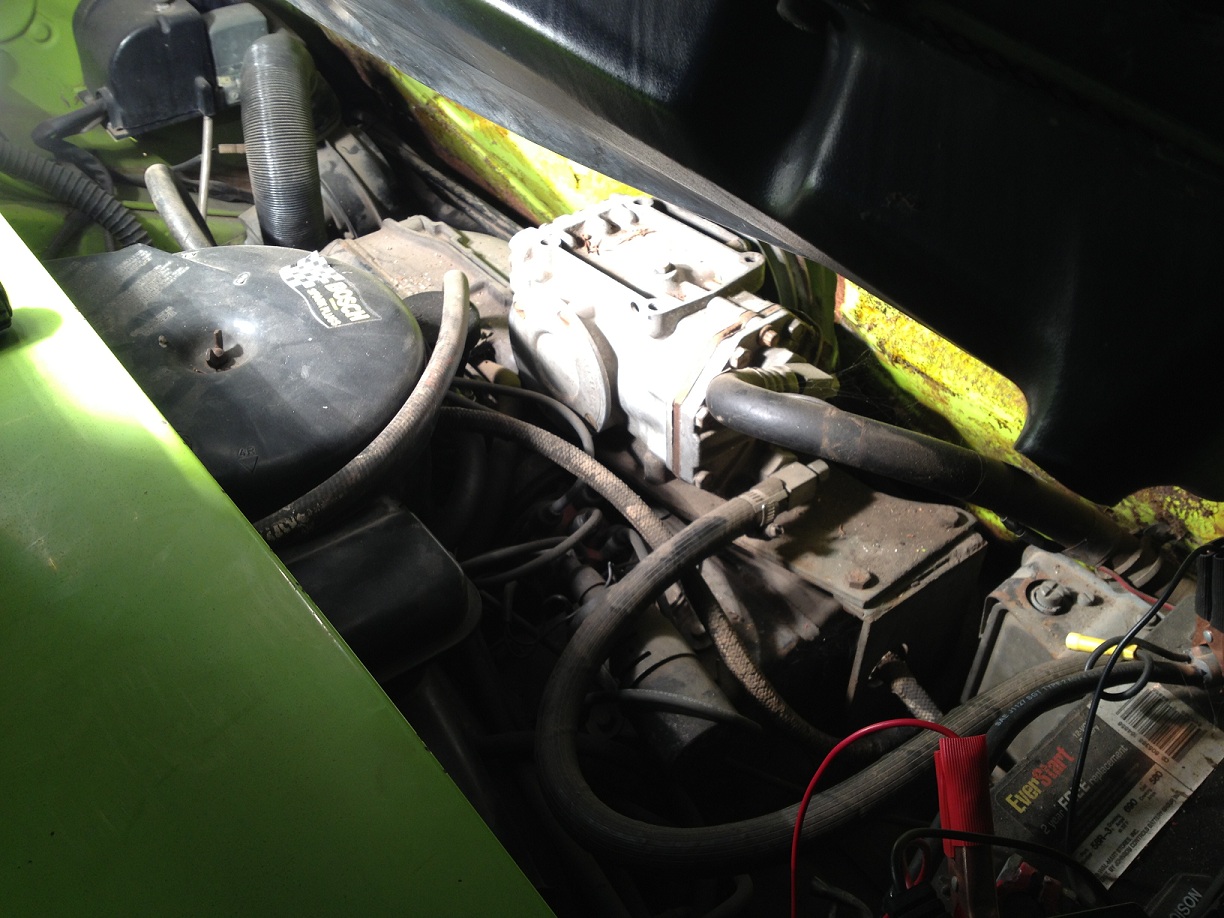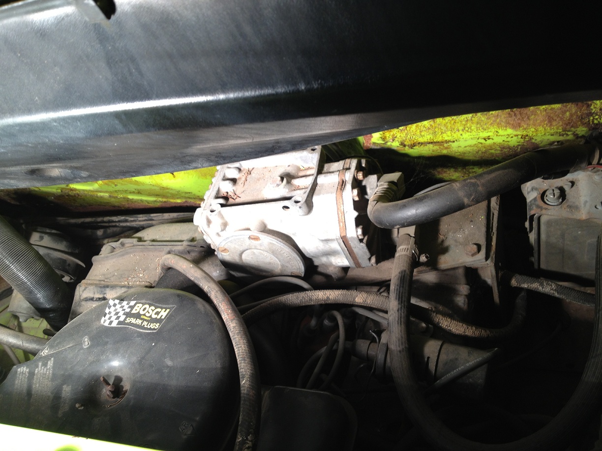 Finally got to the car last weekend and snapped some pics of the compressor on my '73. It also looks like once the bolts are undone (I counted 4), that it would actually have enough hose length to be able to rest it on the rear deck lid. Planning on dropping the engine soon and was worried about suspending it, but seems like it'll sit up there nicely during the drop.