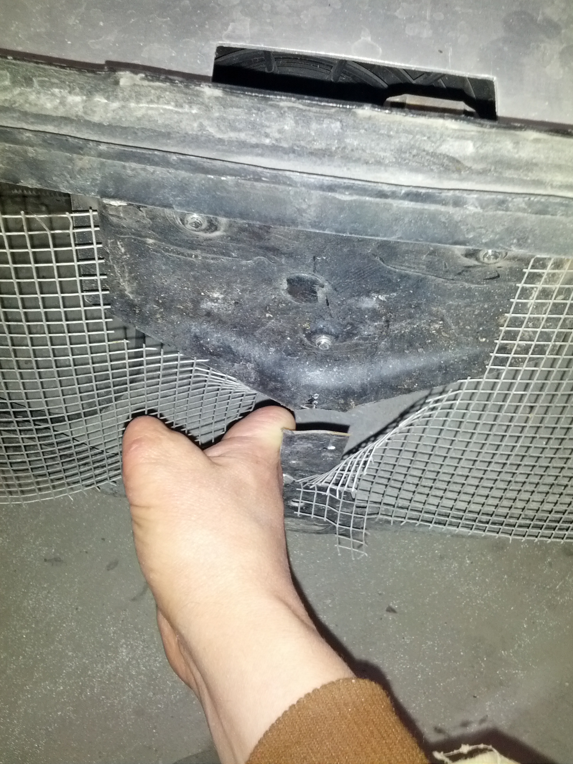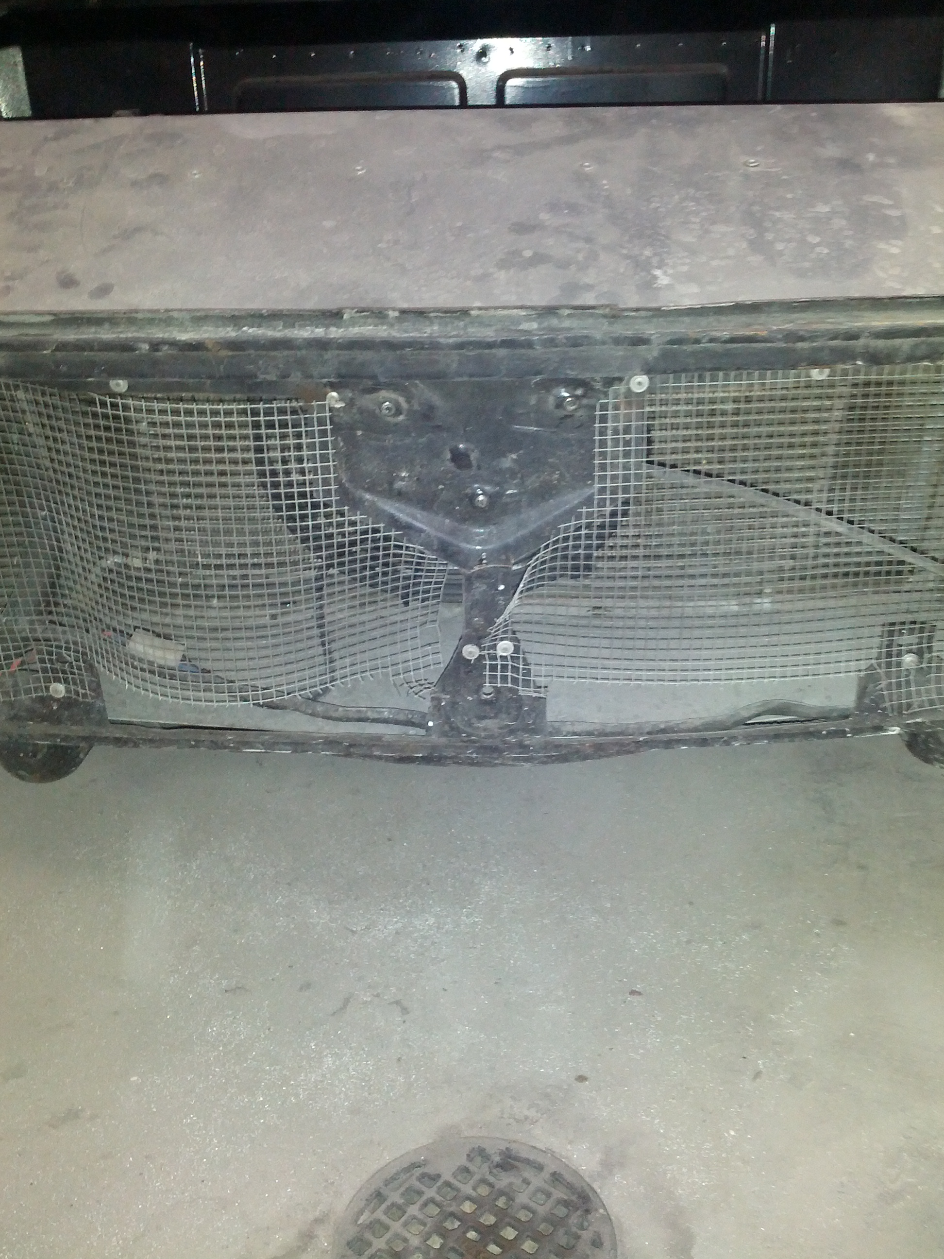 Here you can see how PO really only left the bare minimum or metal behind the bumper. And, as it turned out, less than the bare minimum, since it cracked right across and left the hood latch without any support in 2 of 3 directions. Steve is going to come up with something to replace the strength without closing down the air flow any more than necessary. (BTW, we are planning to come up with something a little nicer than chicken wire when we put her back together) Attached thumbnail(s) |