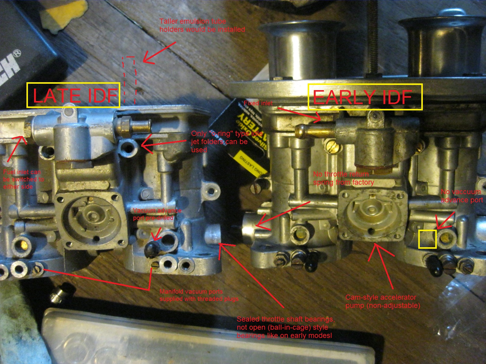 Now, I understand for most people, the process is fairly straightforward and many of you will think it unnecessary to give a step-by-step. After all, most rebuild kits only include a handful of parts and the location and function of most pieces are obvious. But there are some important additional steps that one can take to truly ensure the rebuild process goes smooth and that you won't have to do this over again immediately after reinstalling the carbs. Here it goes! First, I would like to outline the fact that not all Webers are the same. Not only are there different models of IDFs (the 36, the 40, the 44 and the much rarer 48), but there are "early" style carbs and "later" ones. I'll try to list some of the most obvious differences, which are to the best of my knowledge true in most cases, but may not hold true in all of them. Here are the tools you'll need for the job: -Carburetor rebuild kits (CB Performance or Redline are the most common) -8mm open/closed end wrench -10mm open/closed end wrench -11mm open/closed end wrench -19mm open/closed end wrench -Smaller flat tip screwdriver -Large flat tip screwdriver -Brass brush -Paint gun brush cleaning set -Small hammer -Brass punch set -Razor blade -Carb cleaner -B-12 Carb dip -Anti-seize -Shop towels -Compressed air source (preferably) -Clean workspace, preferably with white background Optional: - (4) 3/8 x 24 Brass Hex grub/set screws - Allen keys -SAE Tap and Die set Below is a picture of an early and late set of Weber 40 IDFs. Some of the characteristics of EARLY versions are: -Short emulsion tube holders -Short throttle shafts with little overhang outside of the carb body -Non-sealed, ball-in-cage style throttle shaft bearings -Cam-actuated, non-adjustable accelerator pump assembly -No ports for "ported" vacuum (still has 2 "manifold" vacuum ports) -76 degree bevel throttle plates (this may or may not hold true for every set of early carbs) -No throttle return springs installed from factory (thanks Kevin for clarification) -Most (all?) were made in Italy and are stamped as such Later style Weber 40 IDFs (Weber 40 XEs) are usually characterized by: -Taller emulsion tube holders which extend above the carb top -Longer throttle shafts -Sealed black throttle shaft bearings -Adjustable, spring cushioned accelerator pump assembly -One pre-drilled ported vacuum port in addition to two threaded manifold vacuum ports -78 degree bevel throttle plates -Factory installed throttle return springs -Made in Spain, but potentially also Italy and Brazil Please note that most of these instructions to follow are also true for 44s and 48s as well. The main difference being the way that the secondary venturis are designed. |