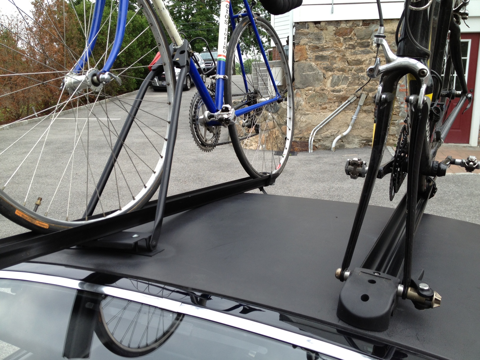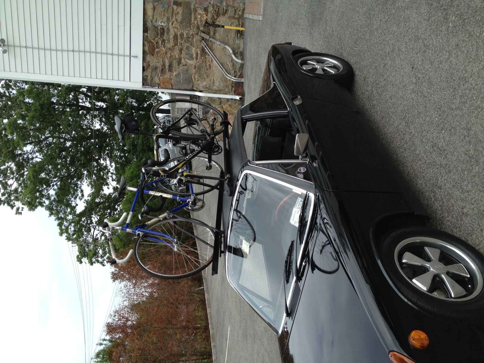 Added a second bike rack to my extra targa top. This one attaches to the front fork with the wheel off. Tested it and the entire unit seems stable ... we'll see how it holds up on a windy day!