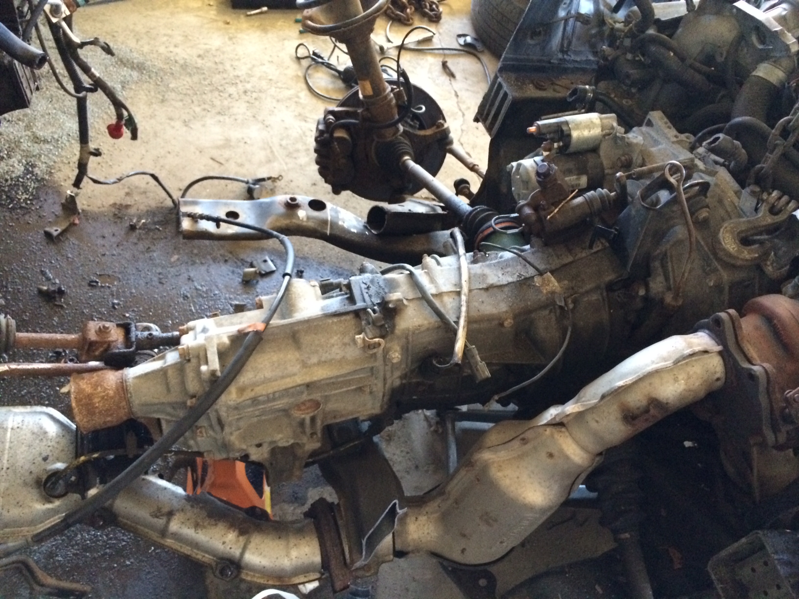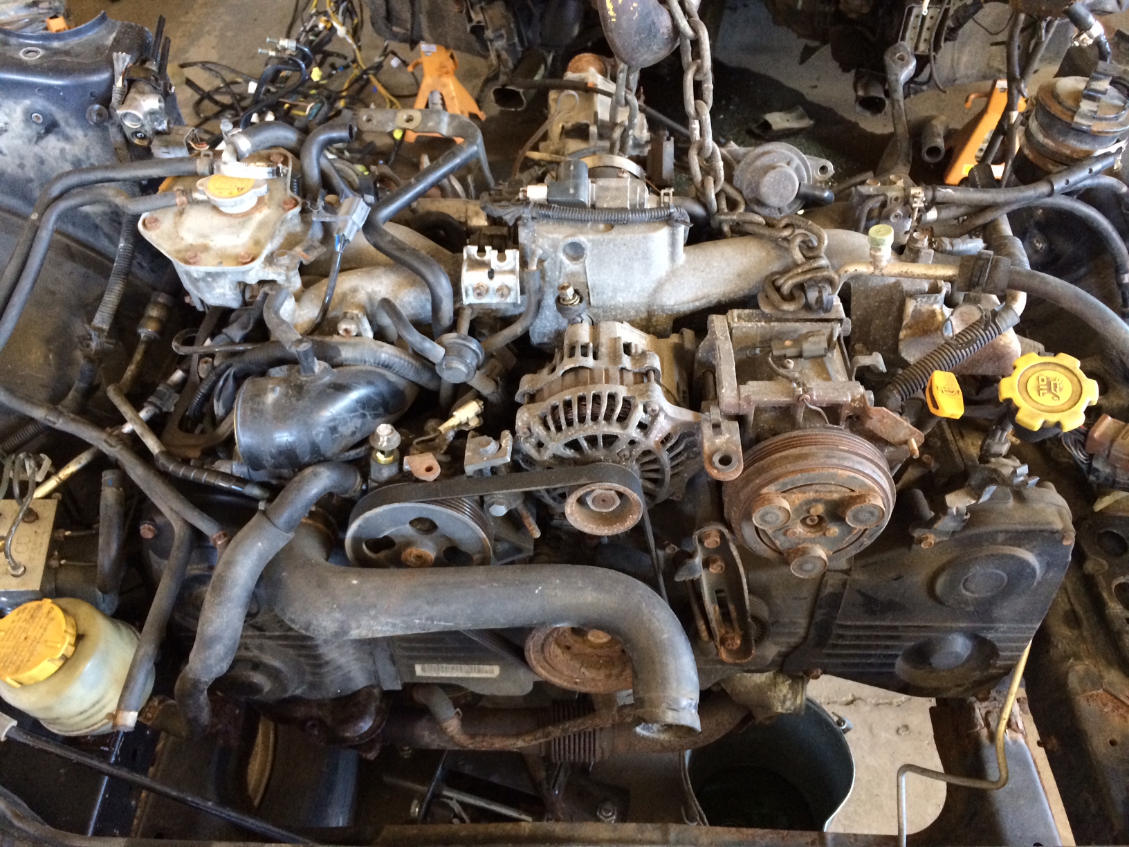 Got to the "Donor WRX" today to start pulling stuff. I have NO idea how much of the wiring harness I'll need, so I just grabbed all of it. Every inch of wire from the entire car. I'm sure it's overkill, but I'd rather have more than not enough. Ian told me last week "do yourself a favor and just send the wiring harness off to Small Car Performance" and I think I'm A-OK with that, after seeing the magnitude of what is needed for the wiring. There's 60LB of stuff here, and I'll bet I get 10lb back. Also have most of the engine out of it. We just sawzalled the front clip so we could get a little deeper into it without restriction. I should have everything off in a week or so as I get closer to pulling the V8 out of my 914. I'm toying with the idea of having someone else re-build the motor. Just to be on the safe side. I'd rather KNOW I'm starting with something that's solid. Besides, now is the time...right? I can also put some upgrades inside and add a few HPs in the meantime. So...that's a little progress. Right? Attached thumbnail(s) |