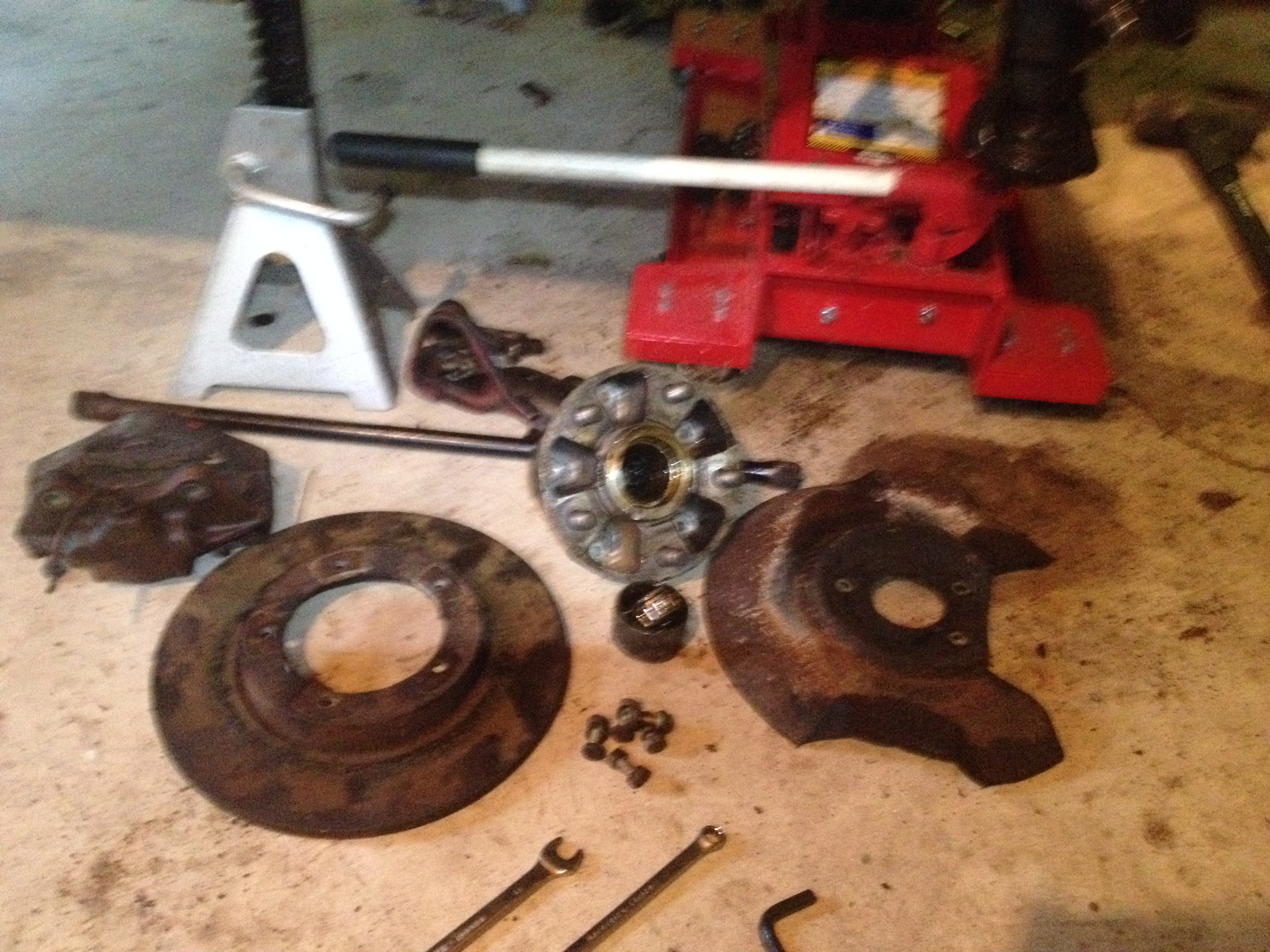 ..The pile of stuff. Will be dumping the rotors, and sending calipers back for cores, am upgrading to vented rotors front and rear and putting on new calipers as well as new Master cyl as well as new rubber lines, and most of the metal lines it looks like. Most looks good but the dust shields are very rusty and thin, will be interesting to see how it all works out.