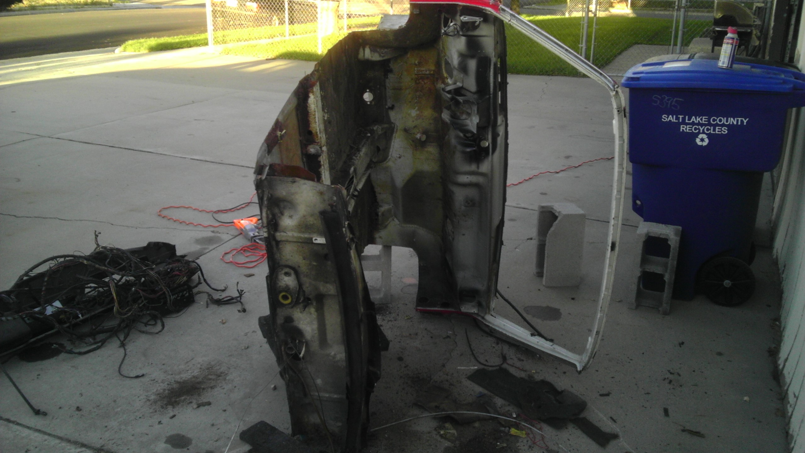 James, it is indeed your quarter panel. If that car hs good longs you can always put a complete QRS kit on it! (IMG:style_emoticons/default/biggrin.gif) (more on that in our next build thread). Thanks for the good metal!! Longs were solid front to rear, cut them out in one piece and they went to Guy to patch up his -6 project. The problem with that car was the floor pan (and shoddy PO repair of it along with a lot of other hidden gems) More work then it was worth it to me and I came across that donor chassis that is now the purple car to replace it. Original windshield was cleanly removed and then broken a month later by me when I forgot I stored it under my autox car *DOH* The 1.7 and side shift got cleaned up and went in the purple car for my wife. Wish I had known about your wiring issues, I managed to pull the entire harness out of that car in one piece. This is all that was left when I threw it on the back of someones pickup truck for scrap. You better get started on another project soon, I only have one more car left to get rid of! |