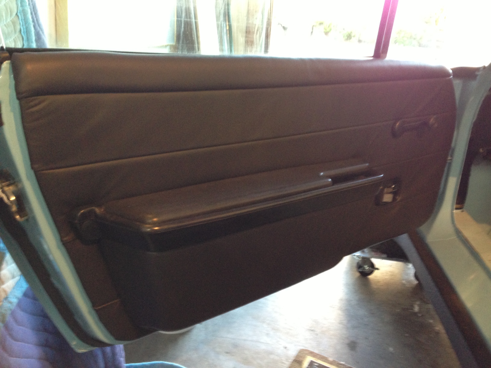 I finished assembling the drivers door and mounted the interior face that I had made many years ago. Its leather and I should have stored it laying flat. Hopefully the wrinkles will relax. I couldn't find all the square nuts that fit in the retainer clips for holding the passenger door handle on, so that one isn't on yet. A heat gun will get rid of the wrinkles. Just use it carefully. |