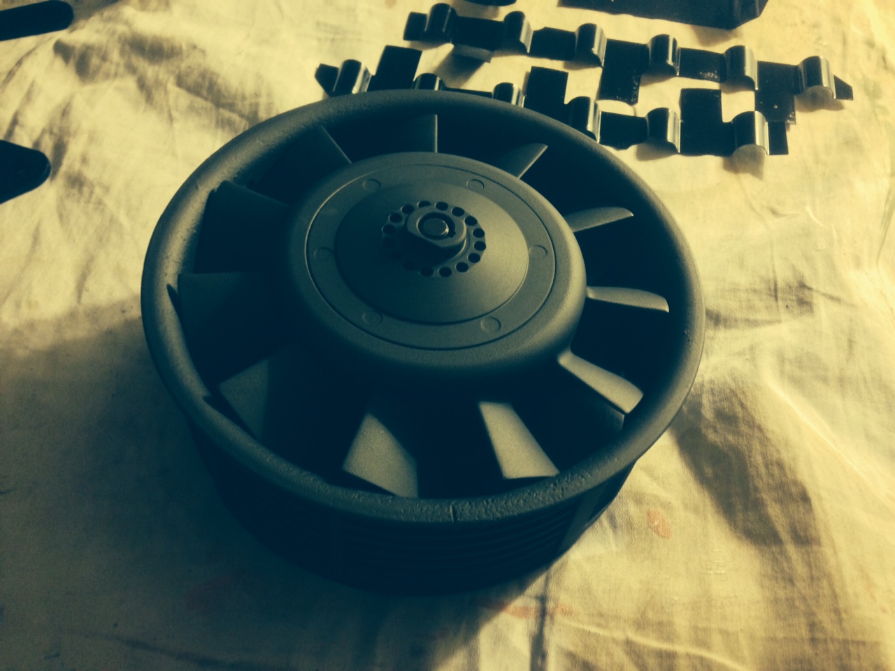 Lots of stuff today! The diffusers that go between the cylinders and guide the flow of air came back from the powder coaters