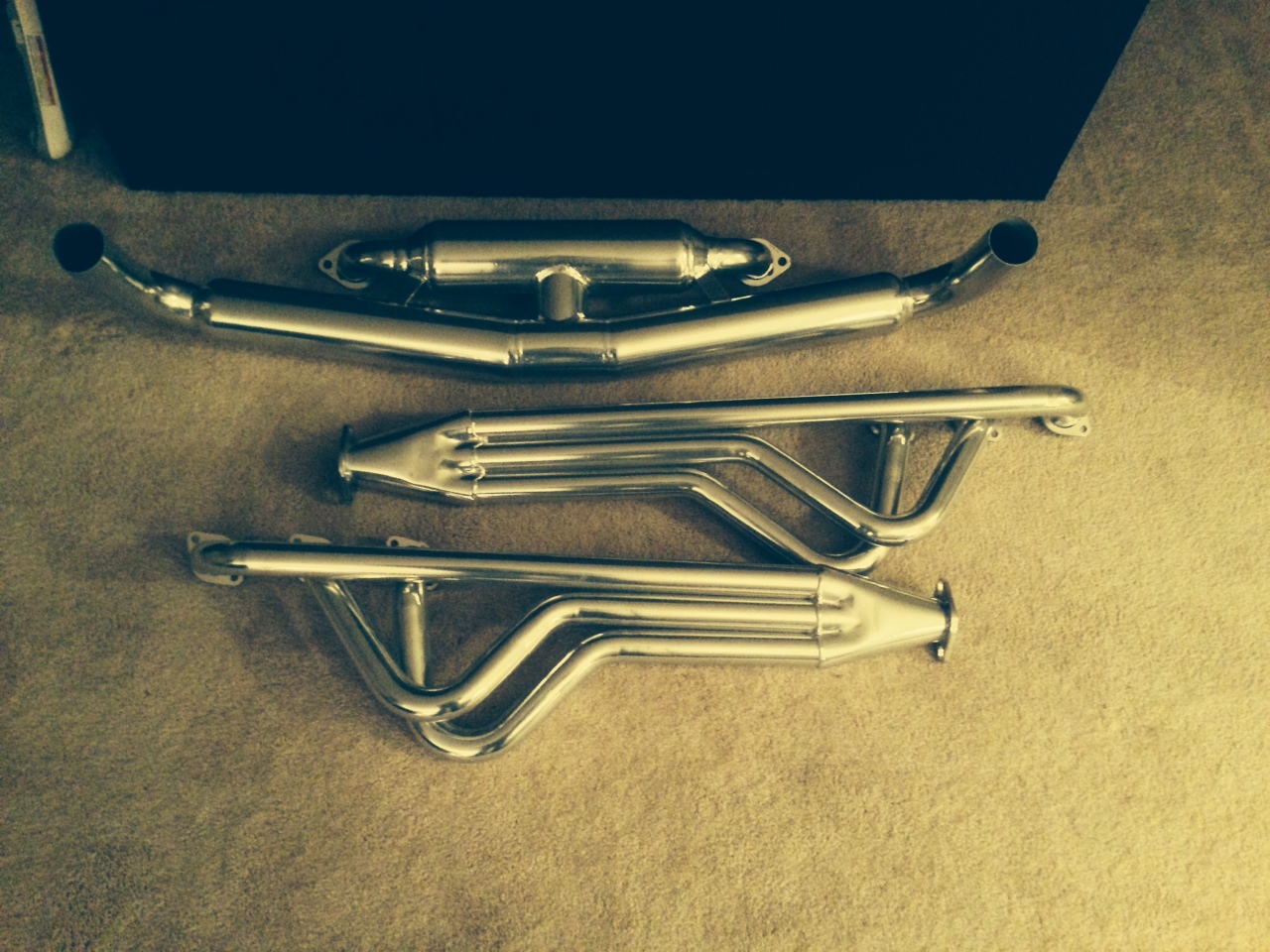 The alternator that was rebuilt and the fan casing and fan (the ring that secure the fan belt is still at the shop). Its actually titanium colored, but the camera lighting made it look black And the headers and muffler |