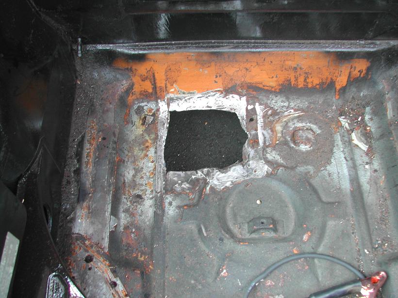 ok..so i began repair on a rust hole in the front trunk today. i cut out the hole..pretty generously, then i cut a piece from my parts car to fit it. i "persuaded" it to fit as best as possible, and i welded the top half, ill do the bottom next week and prime it