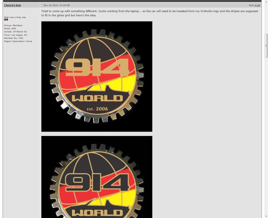 My submission was a concept that I was under the impression I would have time to refine, as is the case with any artwork intended for manufacture. Given the quality of other submissions this is quite reasonable to assume. What was taken by Mark for the vote was never meant to be the final artwork. My problem is Mark's resistance to allow changes to be made, plus his insane rush to jump into production. I said what I needed to -- to put the brakes on. I am only demanding the opportunity to refine the concept, make changes based on feedback, and let the membership agree it's the best it can be. As far as Mark goes, today's pm was a sign of the cooperation I was expecting, so I'm glad I didn't post yesterdays true feelings. (IMG:style_emoticons/default/beerchug.gif) I did state that changes had to be made... (IMG:http://www.914world.com/bbs2/uploads_offsite/lh3.googleusercontent.com-431-1421028865.1.jpg) |