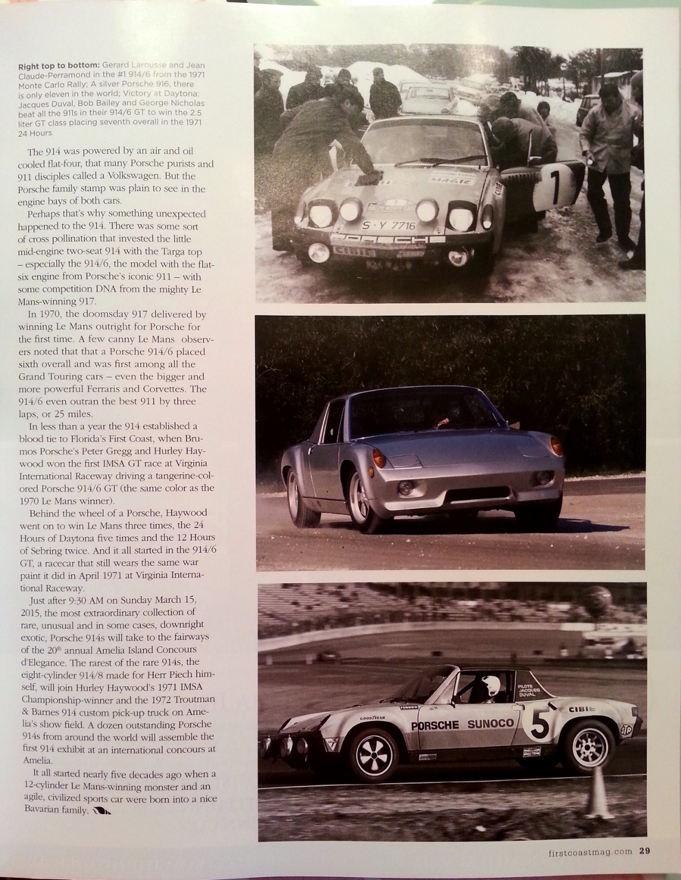 This month's issue is dedicated to the 20th Anniversary of the Amelia Island Concours d'Elegance - which includes an article showcasing this year's featured and honored car - the Porsche 914 First Coast Magazine February 2015 Here is the full article. You may also find it online here: First Coast Magazine article: Porsche 914 - Born Under a Fast Sign Porsche 914 - Born Under a Fast Sign - A factory-entered Porsche 914/6 finished third in the 1971 Monte Carlo Rally Porsche’s 914 began life in the late 1960s as a joint project between corporate cousins Porsche and Volkswagen. The economies of scale and the well-established engineering expertise of the famous German sports car maker made for a natural partnership. Volkswagen required a sporty two-seater to replace the aging Karmann Ghia. Porsche needed something worthy of the Porsche crest but much less expensive than its well established six-cylinder 911. The project was given to Dr. Porsche’s grandson, Ferdinand Piech. At the time Piech had other pressing corporate engineering responsibilities. He was creating a monster. After two decades of being the king of road racing’s undercard, of being the gutsy underdog and more often than not the giant killer, Porsche was ready to fight for sports car racing’s ultimate prize: outright victory in the 24 Hours of Le Mans. Herr Engineer Piech was their point man. That a colossus like Porsche’s 917 could simultaneously occupy the same intellect as the civilized Porsche 914 sports car seems peculiar. But both the 917 and the 914 carried their engines behind the driver as pure race car engineering orthodoxy demanded. - Gerard Larousse and Jean-Claude Perramond in the #1 914/6 from the 1971 Monte Carlo Rally The 917 debuted a year after the 914 arrived in showrooms, and served notice at Le Mans that the rules writers of international sports car racing had left a huge loophole in the paragraphs about engine displacement and production numbers. The 917 packed a monster 4.5 liter air-cooled flat-12 that made enough power to blast through the loophole and shove the 917 down the Le Mans’ Mulsanne straight at something over 230 mph. The 914 was powered by an air and oil cooled flat-four, that many Porsche purists and 911 disciples called a Volkswagen. But the Porsche family stamp was plain to see in the engine bays of both cars. Perhaps that’s why something unexpected happened to the 914. There was some sort of cross pollination that invested the little mid-engine two-seat 914 with the Targa top – especially the 914/6, the model with the flat-six engine from Porsche’s iconic 911 – with some competition DNA from the mighty Le Mans-winning 917. In 1970, the doomsday 917 delivered by winning Le Mans outright for Porsche for the first time. A few canny Le Mans observers noted that that a Porsche 914/6 placed sixth overall and was first among all the Grand Touring cars – even the bigger and more powerful Ferraris and Corvettes. The 914/6 even outran the best 911 by three laps, or 25 miles. In less than a year the 914 established a blood tie to Florida’s First Coast, when Brumos Porsche’s Peter Gregg and Hurley Haywood won the first IMSA GT race at Virginia International Raceway driving a tangerine-colored Porsche 914/6 GT (the same color as the 1970 Le Mans winner). Behind the wheel of a Porsche, Haywood went on to win Le Mans three times, the 24 Hours of Daytona five times and the 12 Hours of Sebring twice. And it all started in the 914/6 GT, a racecar that still wears the same war paint it did in April 1971 at Virginia International Raceway. Just after 9:30 AM on Sunday March 15, 2015, the most extraordinary collection of rare, unusual and in some cases, downright exotic, Porsche 914s will take to the fairways of the 20th annual Amelia Island Concours d’Elegance. The rarest of the rare 914s, the eight-cylinder 914/8 made for Herr Piech himself, will join Hurley Haywood’s 1971 IMSA Championship-winner and the 1972 Troutman & Barnes 914 custom pick-up truck on Amelia’s show field. A dozen outstanding Porsche 914s from around the world will assemble the first 914 exhibit at an international concours at Amelia. It all started nearly five decades ago when a 12-cylinder Le Mans-winning monster and an agile, civilized sports car were born into a nice Bavarian family. - Brumos' Peter Gregg hard on the brakes in his 914/6 GT at Sebring 1971 - George Larousse and Jean-Claude Perramond 914/6 in the 1971 Monte Carlo Rally - Victory at Daytona: Jacques Duval, Bob Bailey and George Nicholas beat all the 911s in their 914/6 GT to win the 2.5 liter GT class placing seventh overall in the 1971 24 Hours - A silver Porsche 916, there are only eleven in the world |