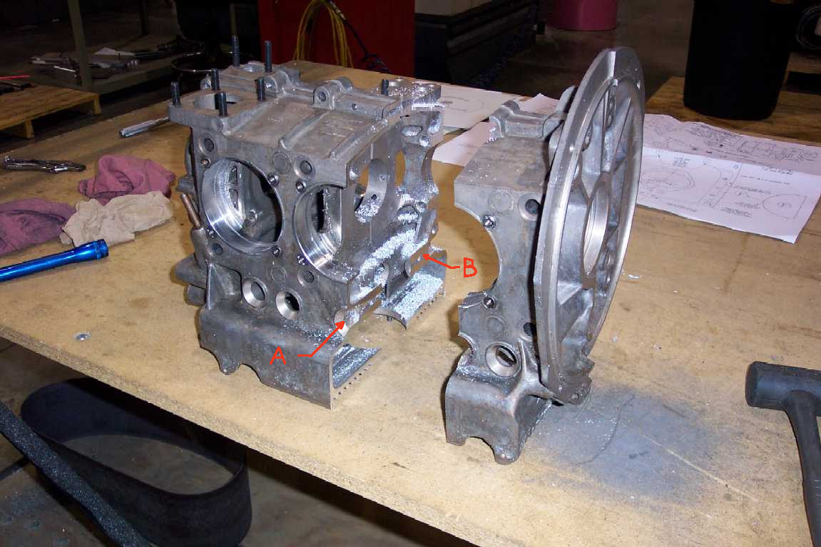 Before you cut: (IMG:style_emoticons/default/biggrin.gif) Leave excess material for finishing weld prep on both sides of crankcase. Prepare hollow steel shafts to locate both cam and crankshaft bores +.0005/-0.0002",longitudinal spacing can be accomplished by using case thru-bolts or cylinder spigots. This Type 1 case has been cut through the lifter bores,not good. The type 4 case must be cut to avoid critical areas and to facilitate ease of welding. The Corvair case has symmetrical attributes and a flat milled open top that allows reinforcement plates or a cam carrier to be attached. A great deal of thought and mapping must be done to attempt a +/-0.003 weldment,preheating and inert gas atmosphere enclosure to ensure top quality welds and alignment. An adventure in engine building,not mere assembly. (IMG:style_emoticons/default/happy11.gif) |