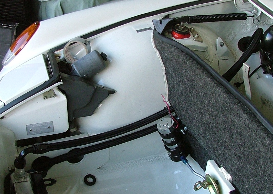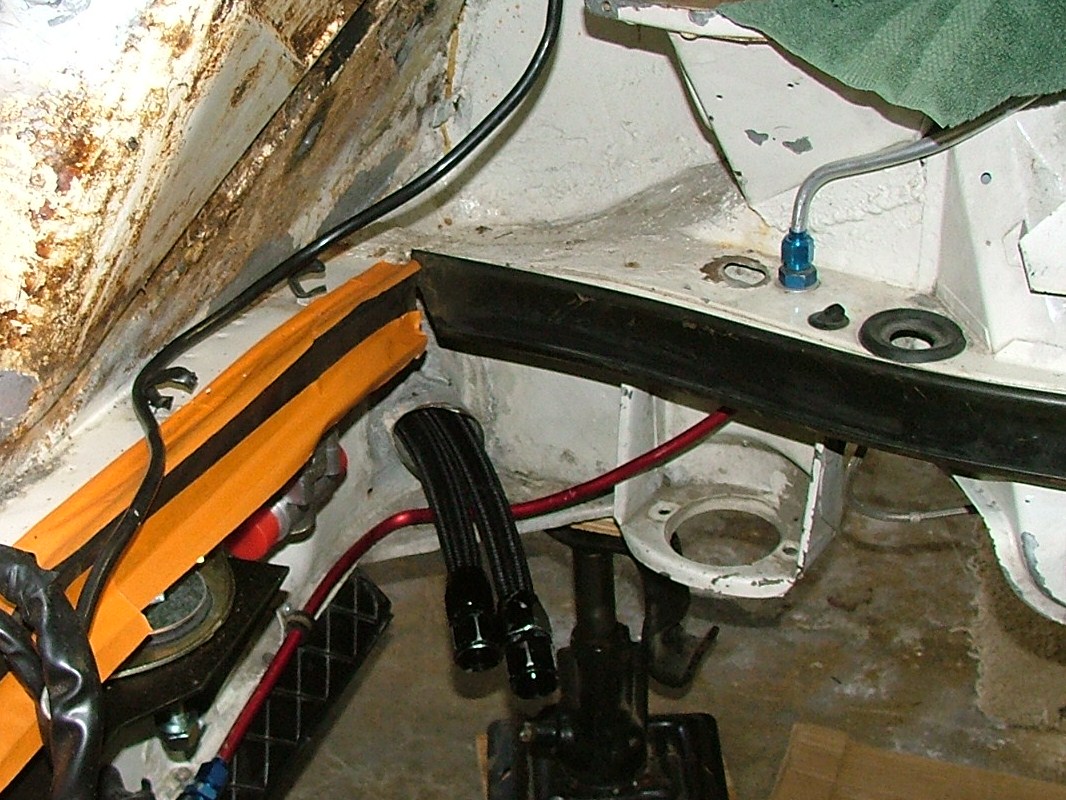 So I decided to run the oil hoses from the front trunk oil cooler back to the engine compartment through the passenger heater tube. A slick idea from the PO but I have to admit I was concerned they would actually fit as the hoses came made up with AN 12 fittings already on. The short story is it worked! I made numerous attempts trying different approaches wanting to avoid removing the fittings. Pictures will show that I filed the the sharp edges of the B nuts, purist will shudder, but they were actually cutting the duct tape as they came through the long tube being pulled by garden hose. In the heat of the moment and the sweat of the fun I neglected to take in process pictures (just imagine duct tape around the two hoses). The final approach was one at a time and you HAVE to have a another person to push as you pull. It really does look cool though! The upsides are; no cutting of holes in fenders, no external lines, very clean look when done. Downsides are; no heater, filing the B nut edges, modifying the heater tube just inside the engine compartment, and worst of all modifying the gas tank because the hose does not fit past the flange on the side of the tank! It is a nicely powder coated tank too. Have started modifying the tank by dimpling the side but the flange will need to be removed. More on that to follow.....