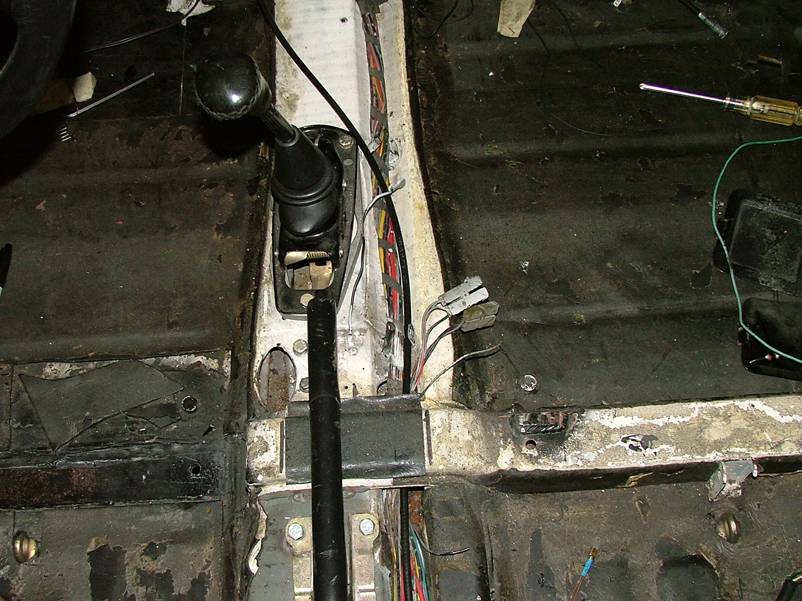 It is my understanding that from '73 up the vehicles had the wiring harness for the center console regardless of whether the console was installed or not. There was connector just forward of the shifter in the main loom that runs in the center tunnel. It not only provided for the wires from the sender, but power to the gauge lighting and grounds. I this picture shows the connector but it is behind the shifter? The wiring for the PO removed console in my car did not come from here but came from elsewhere.