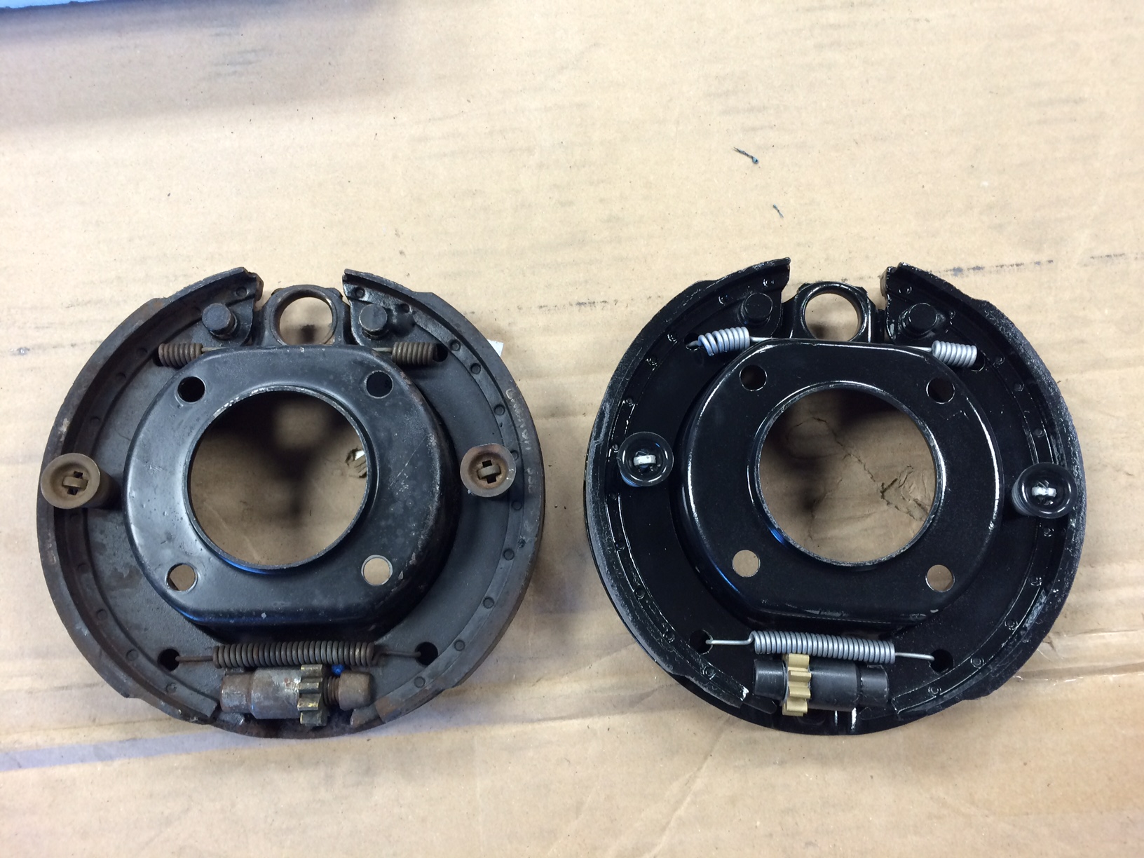 Working on the 911 e-brake set up. Got so excited about getting one done I spaced out on the fact that I have to modify the backing plate to fit the 914 trailing arm. Oh well, it's only paint and I wanted to powder coat them anyway!