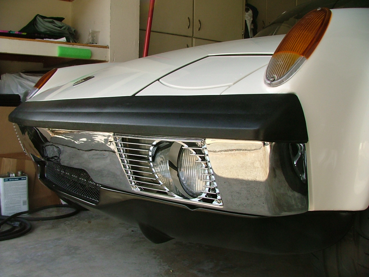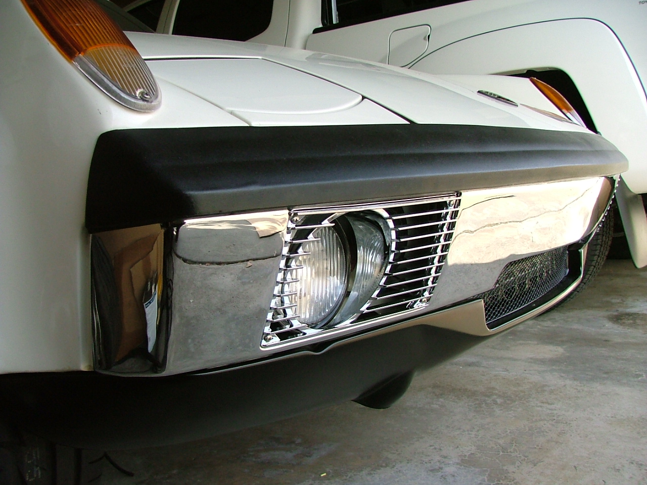 The car as I bought it had a fiberglass bumper and lower valance. First of course was finding a decent front bumper that would be able to be chromed. The bumper I found was just ok and it did have a good bumper top. Second was having the bumper modified to accommodate the intake for the front oil cooler PLUS match up to the fiberglass lower valance. Thanks Chris! Then there was the chrome shop and almost 4 months later. Next was finding some sort of mesh screen to go in the intake. Lastly was fitting it all to the car. Trial fit, trail fit, trial fit, and trial fit. For those looking for an inexpensive solution for the mesh screen I found at the Home Depot that gutter guard worked great and was already painted black, was close to the right size, fairly easy to work with, and like $3.00. How many parts can you buy for $3.00? Note the PO cut extra holes for the oil cooler intake in the front panel, I just blacked out around it. Attaching the mesh to the fiberglass valance was accomplished with strategically placed tie wraps. Attached thumbnail(s) |