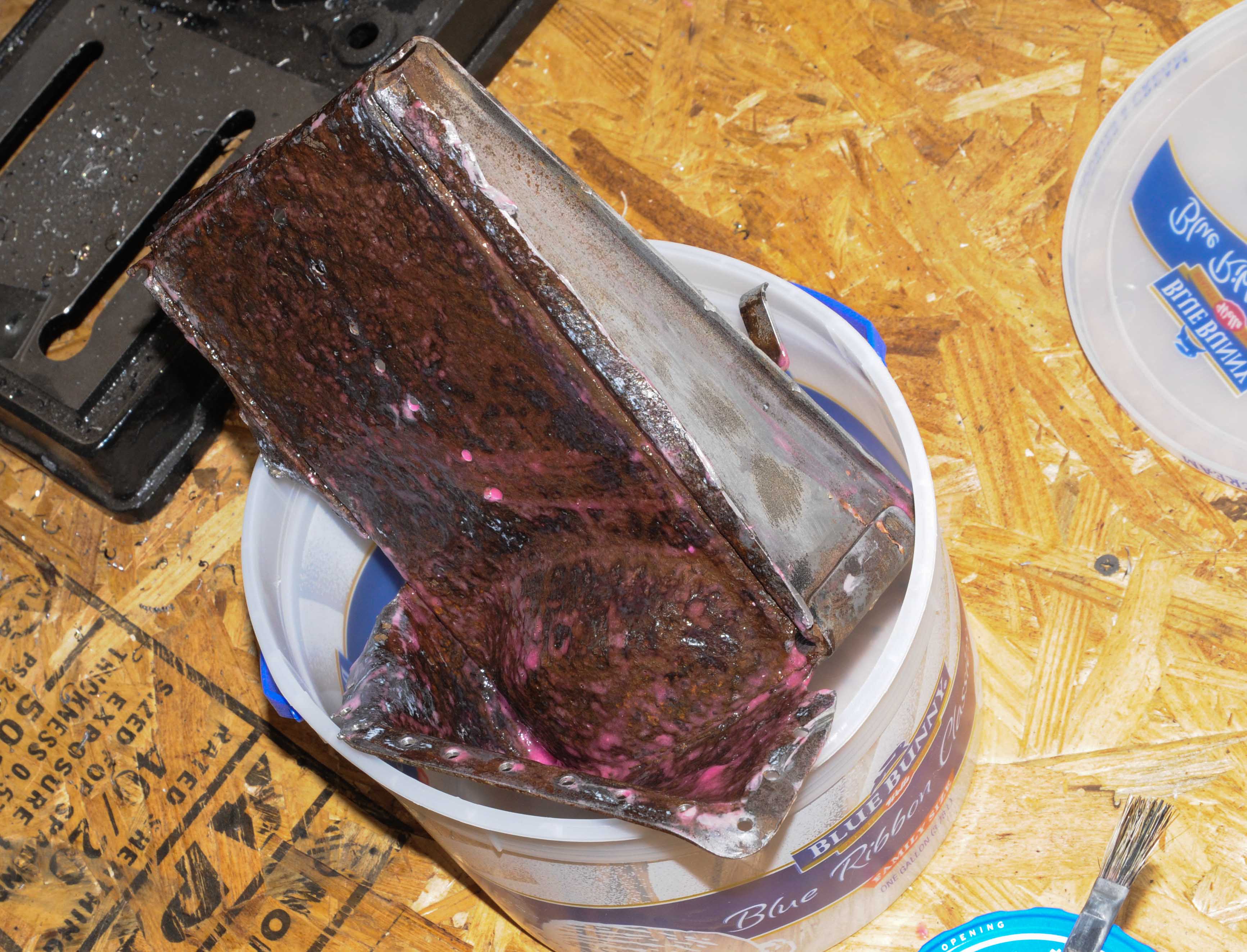 After a weekend or two of measuring, fitting, and bracing, I finally welded a major piece in: the wheelhouse. It fit up pretty well and welded in well, though I definitely affirmed that I am more of a grinder than a welder. I really slacked on taking pictures...but on the other side of this picture is the outer suspension console welded back on. The other picture is the motor mount console being soaked with naval jelly or whatever it's called; I figure it's time to start prepping some parts...