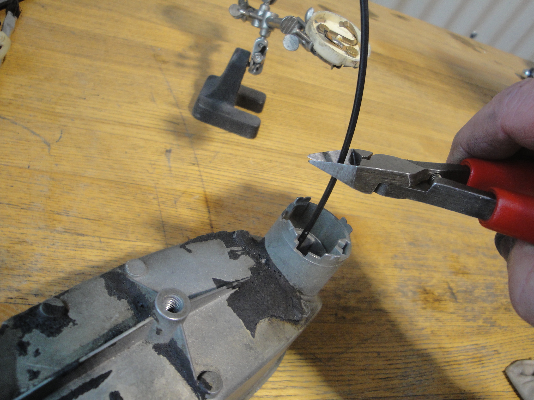 So now, your refractor is set, tight, wire is placed in the three set of retainers. Next flip the housing over to trim excess wire. Leave about an inch or a little more. Not much more.