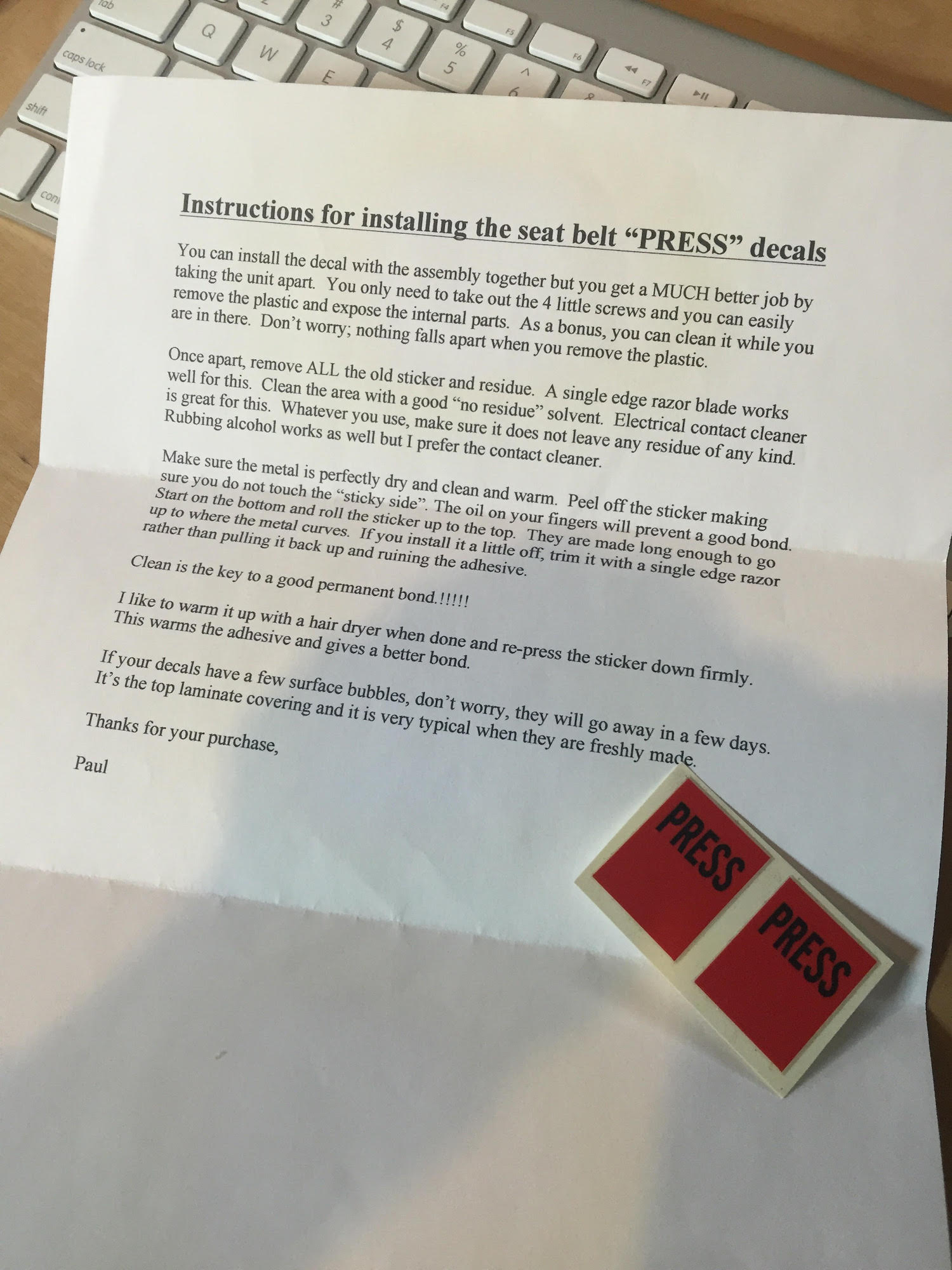 BTW I just ordered a new red handle for the heater lever and have new PRESS red stickers that I purchased from a member to replace the faded ones on the seat belt clicky things. next on my list is a new wood steering wheel from Nardi and then a new dash. after which the seats, door panels, and back bad by summer... then next year suspension and engine redo... goto get this baby in shape.... -jp- Hi JP, Who did you get the PRESS stickers from? I remember seeing them a while back but could not find them recently. hey Ken I can't remember exactly who it was but maybe this will help Attached thumbnail(s) |