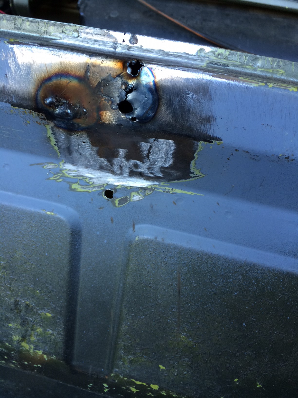 Another repair of PO hole drilling. There were some odd holes in the frunk bulkhead so I went after it. Whatever had happened, it appeared that there had also been some grinding / thinning of the material because I almost immediately blew holes in the holes! (My God, that's hideous! Look away!)