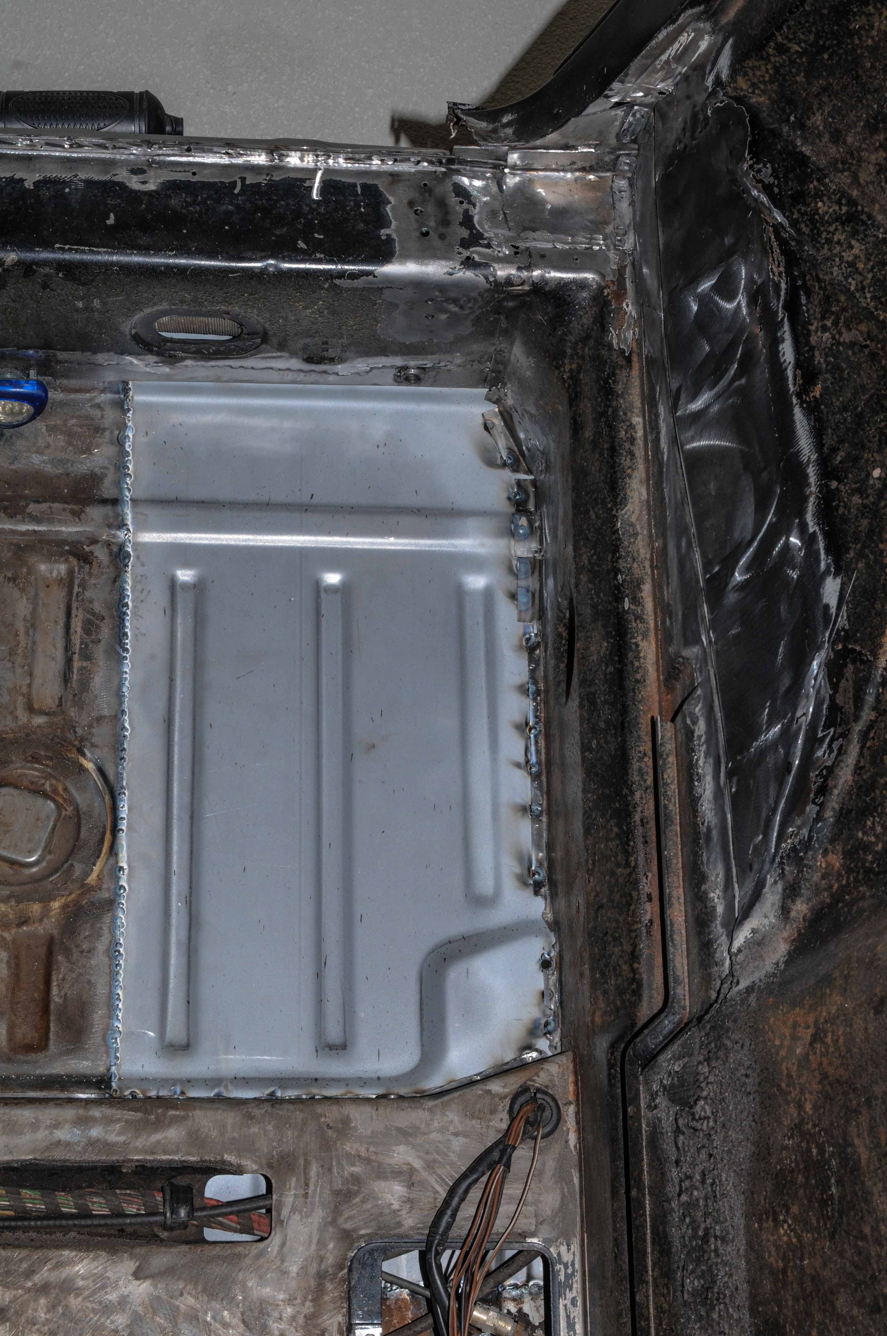 But the big event of the weekend was getting the floor section welded in. I had it fit and ready to go from last weekend, so it was just a matter of lining it all up, getting the edges even, etc. The big task was at the corner where the triangle will go; it stuck up a few mms and almost a cm at the corner. However, starting the plug welds at the other end I found I could hit the next hole's area a couple times with the hammer and it would go down flush all the way down the line. For some reason I threw a couple extra welds at the edge...and wish I didn't..they're extra ugly.