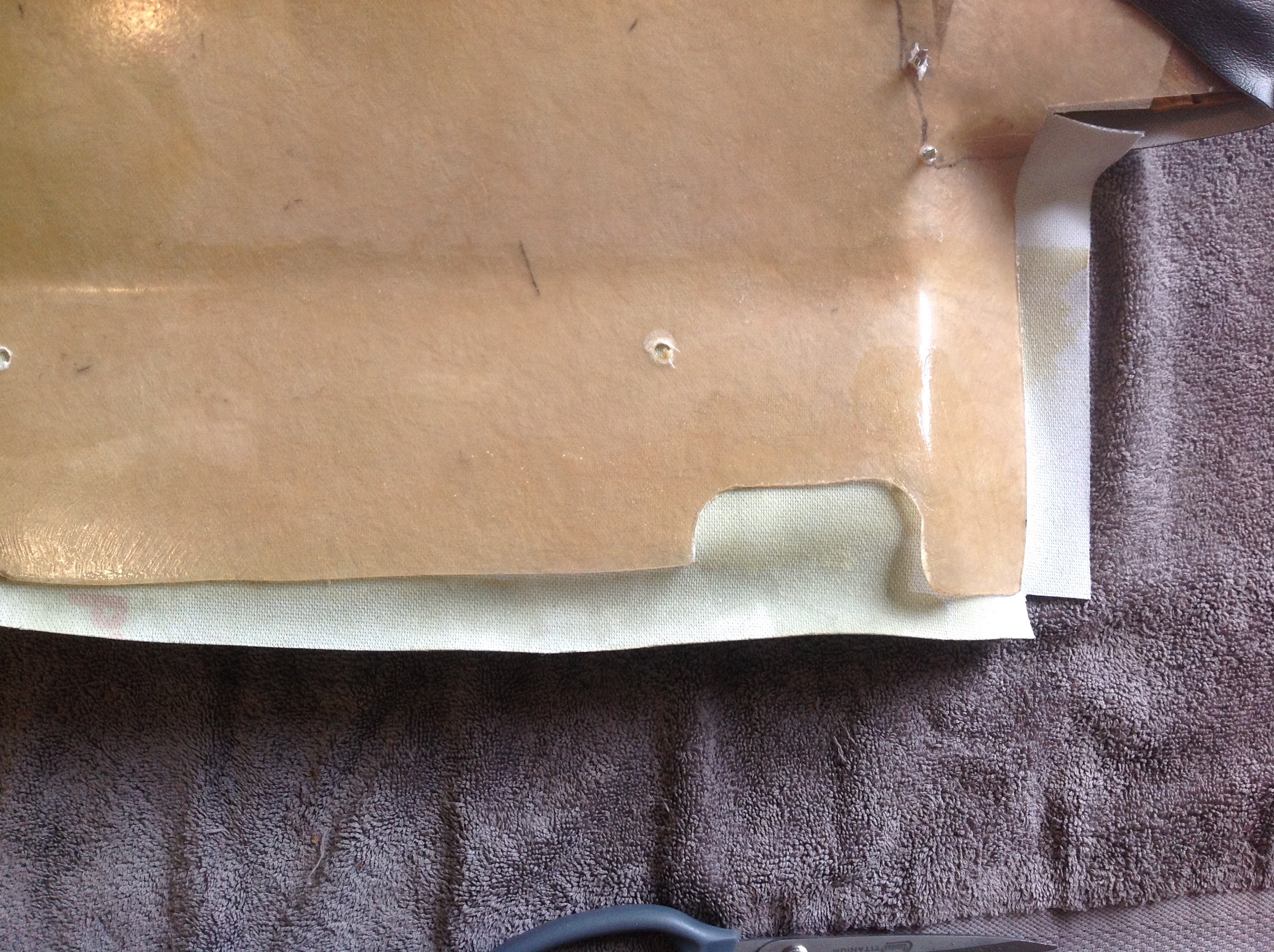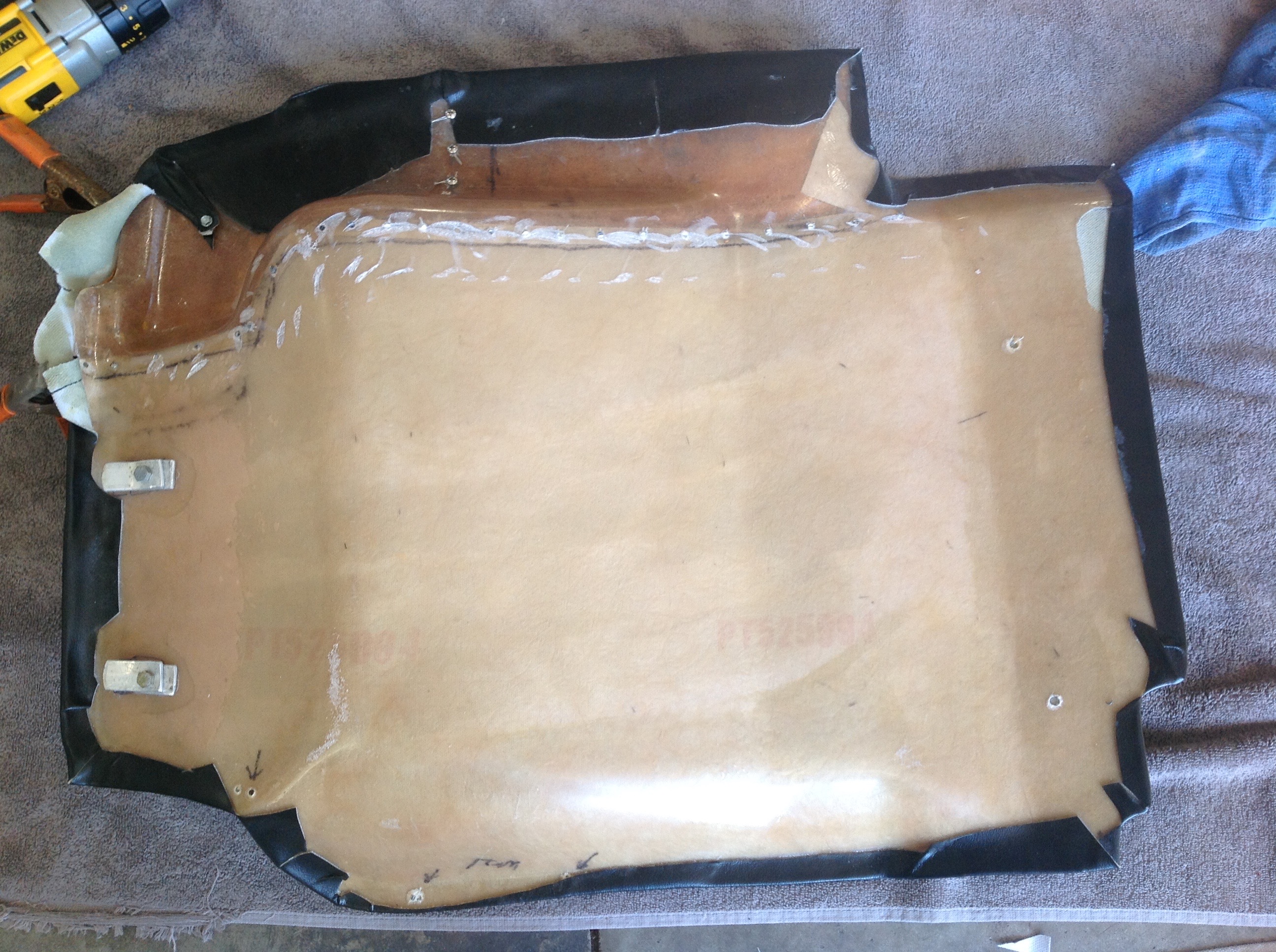 Note the cut-out for the parking brake on the passenger side does not apply and the screws for the tension strip have been cut off. Be very carful when cutting the screw remnants. They are very hot and will go right through vinyl, if you let one get away to the front side. Attached thumbnail(s) |