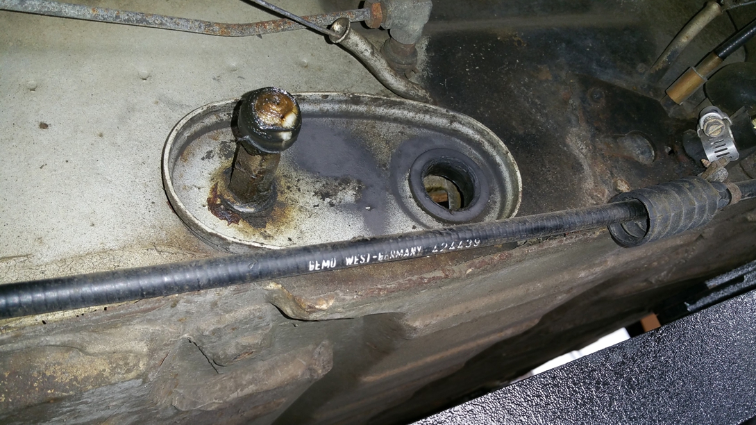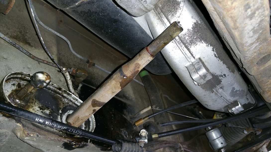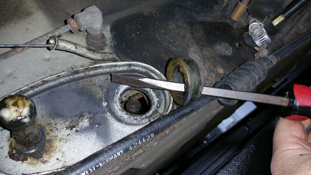 Then the shift connector rod pulled out pretty easily from behind the firewall, along with the rear shift rod. Next I dismantled the front shift rod from the shift rod head. It's a single allen head set screw with a cone shaped shaft. Next I removed the old bushing from the firewall by prying it out with a screwdriver. It came out fairly easily. With the bushing out I could feed the front shift rod out the firewall. |