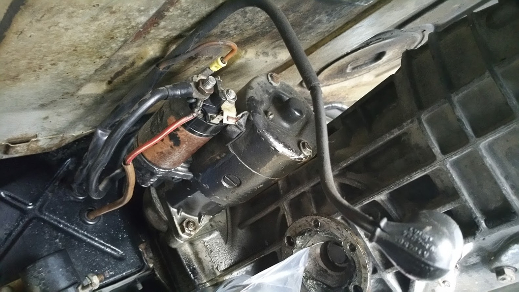 With the tunnel ready to accept the front shift rod, I boiled me some bushing and popped it in. Easy. What is everyone doing for a boot here? The raised metal flange is for tail shift setup, so I can't use a side shift boot here. When I went to finally mount the engine support bar on I realized it was pretty much impossible to bolt the rubber dampers to the engine case (the brackets were already on the case) with the bar in place. So I ended up taking the dampers off the bar and bolting them to the brackets individually. It was still a pain to do this since access to the front of the case is so restricted. The left one went on pretty easy, but the right one was a pain. I had to loosen the upper bolt from the bracket and pivot it to get the damper mounted. Then I pivoted the bracket/damper back up and was just barely able to fit a small socket in there. The oil filter is in the way. Taking it out would make this a much easier task. But I don't have a tool for taking the filter off yet. I finally got them and the bar mounted after an hour of damned tedious work. Glad I'm done with that. With the bar mounted I went ahead and fed the front shift rod into the tunnel through the new bushing. No pic of this. I'll take one next time. Next step is to remove the transaxle. Before I got too deep into that I decided to drain the gear oil. The first minute was dark brown and opaque. Looked pretty nasty to me, but I really have no idea what I'm talking about, so it could be okay...who knows? The magnet had some filings on it. But nothing big (what's big anyway?) While the tranny drained I started disconnecting stuff. First the speedometer cable. I loosened the light colored nut here. Discovered it was a left hand thread before I destroyed it thankfully. Then I unbolted the CV joints. Removing the reverse light switch. Add this to the shopping list. This looks like its been at the bottom of the ocean for a century. Weird, since the boot is in great shape. Then I disconnected the three wires going into the starter motor solenoid (I think that's right, right?) Two nuts and a washer came off the end of the clutch cable, which allowed me to pull the cable from the lever. The center nut in the middle of the clutch pulley allows the pulley to come off and the cable to detach from the transaxle. Tomorrow I hope to get the tranny removed completely. Then the real fun begins. Get the popcorn, because this greenhorn is about to crack open his first transmission. |