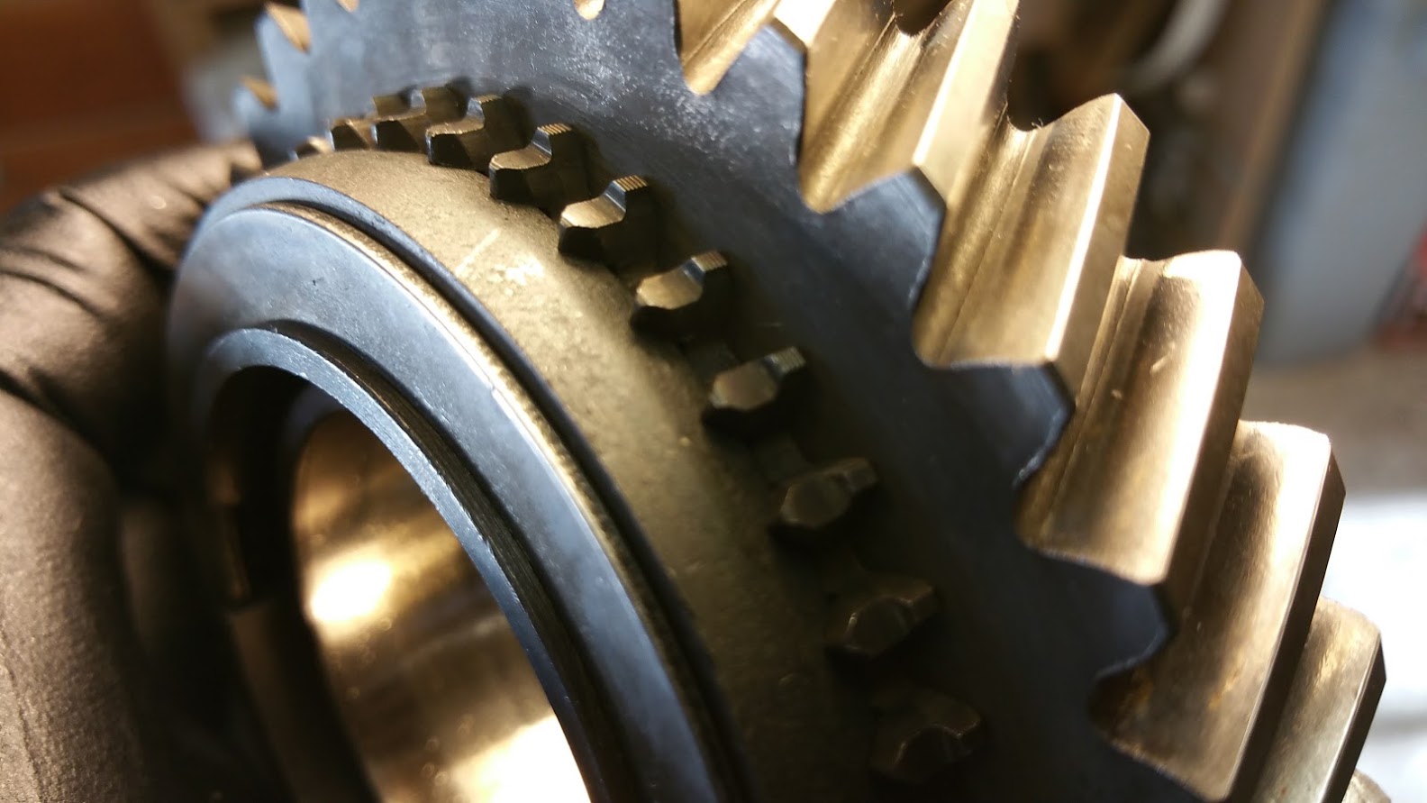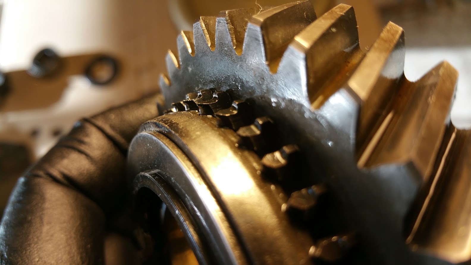 ![]() Here's my first gear. The dog teeth definitely look worse with the gear out of the stack. The new used gear and syncro from Brad. After replacing the gears I replaced the tail shift rods with the side shift rods. This was a tad finicky, but I actually enjoyed it. I spent a good 45 minutes getting everything lined up as perfectly as I could. I want this to shift sweetly. I followed Dr. Evil's steps from the DVD. https://www.youtube.com/watch?v=Dj35Zq-tt98 The inner surface of the intermediate plate was kind of messy. Looks like someone had put some RTV in there at some point. It was really on the surface or the gaskets, just thin remnants mostly in the voids of the casting. I picked it all out with tweezers To prep the case for cleaning I removed the starter motor. The side with the long through bolt had a thin washer under it, but no washer on the stud side. I couldn't find this washer in my Hayne's manual. Any clues here? ![]() It felt good to do something brainless for a change. Tomorrow I may have this back together. |