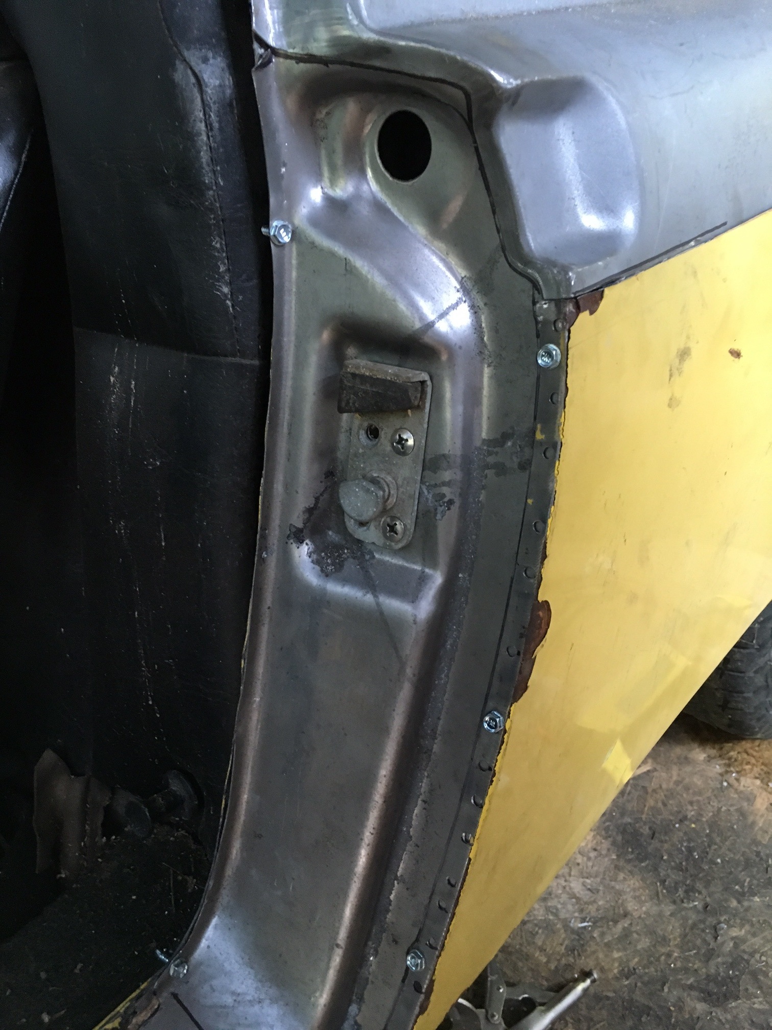 One of the tasks I had to do to the door jamb was to relocate the striker plate for the door. I drilled out the spot welds on the retaining strap on the back of the old jamb. I then used part of the old jamb to locate my holes. I then installed the striker and adjusted the door. Then welded on the retaining strap again.