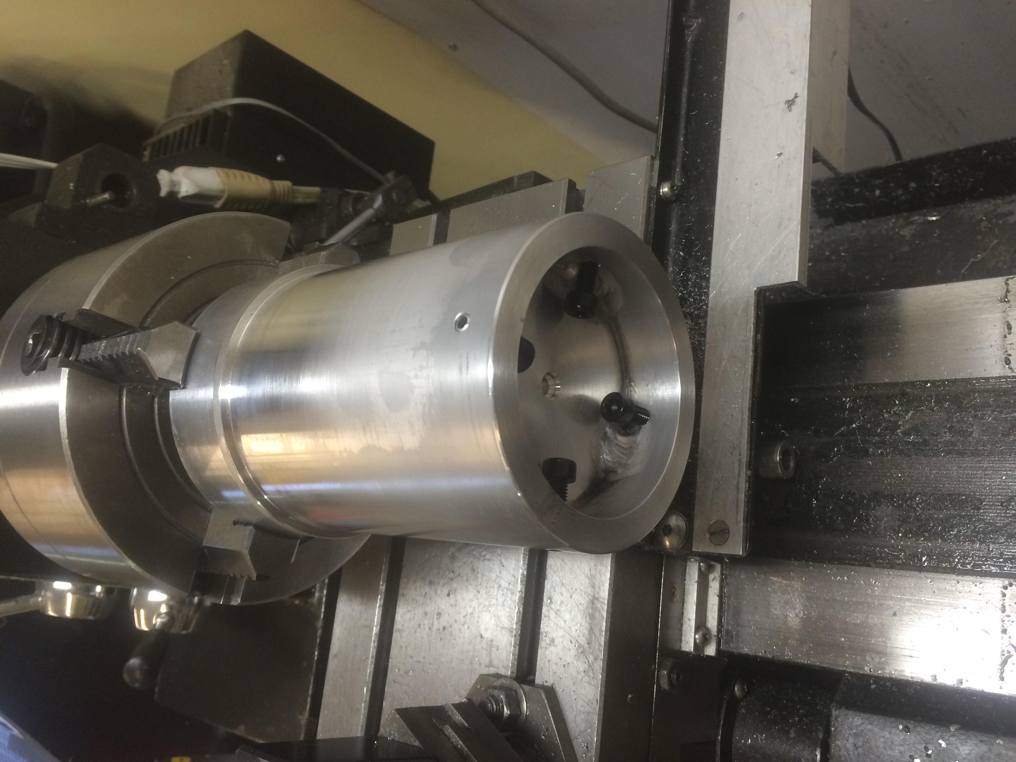 The jugs is very nearly an interference fit onto the fixture, and slides down to a shoulder to ensure all is true. Will use the tailstock on the lathe to make things even more secure/stabil when making the cut to the jugs. There are 4 aluminum set screws on the inside of the fixture to secure the jug. Is this overkill - YES. But all will be very true, and very much the same once completed. |