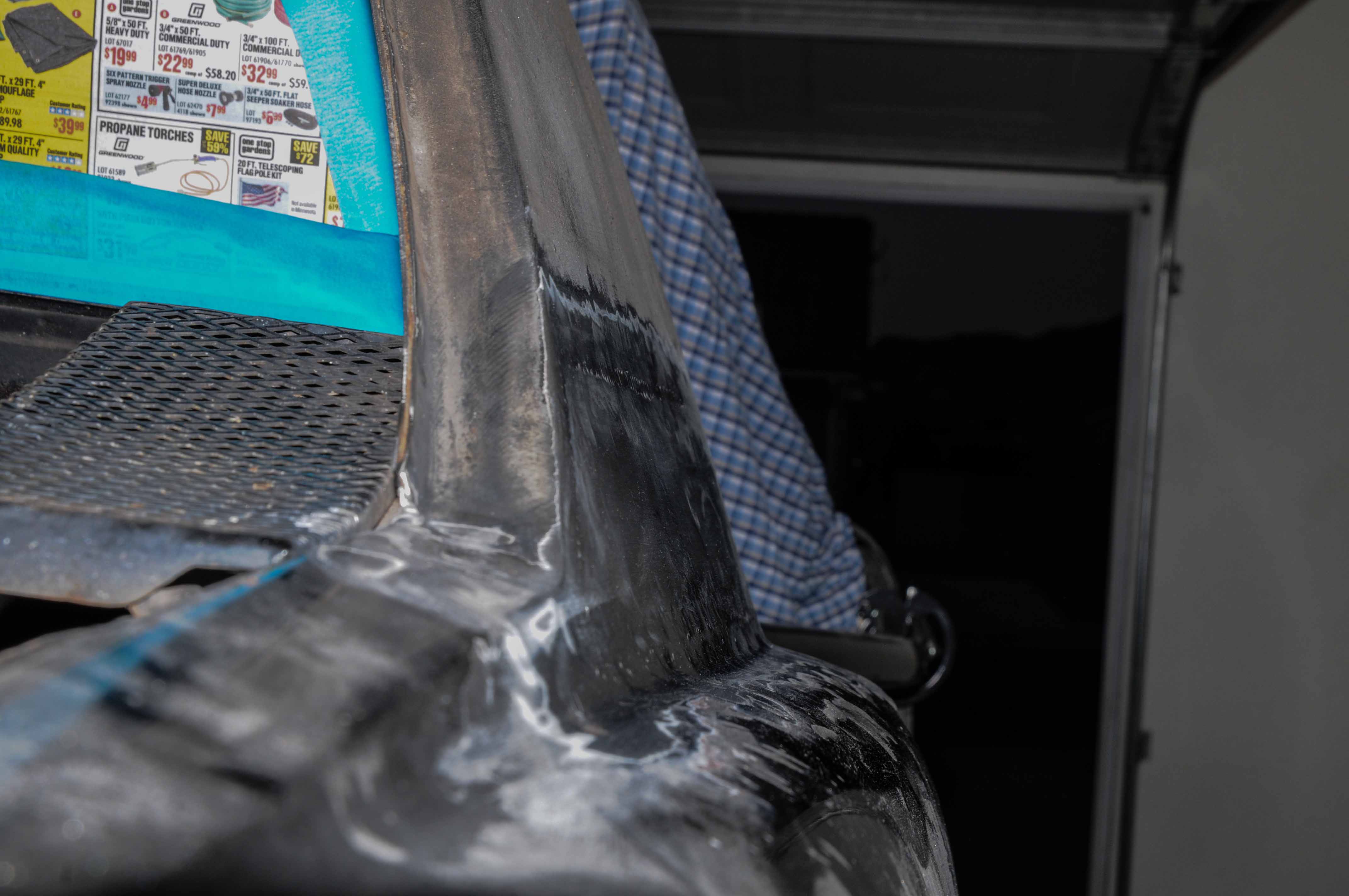 Shop soundtrack: my Iron Maiden Pandora station The day's plan was to get a bunch done in the garage on my day off, but as I was taking the garbage to the street I happened to notice an odd, white spot on my DD Honda Fit's tire. Of course it was a nail. I had been planning on replacing the tires towards the end of summer anyways, hoping to milk a thousand more miles out of them; the previous owner didn't drive the car much so they had minor dry rot along with wear. The funny part is that twice over the last 2 weeks the tire went a little low but on inspection I saw nothing (could it really be possible that the nail was down both times I inspected?). Anyways, I spent quite a bit of the day dealing with this. NOTE: If you buy a Honda Fit for its incredible affordability and such, get the basic model and not the "sport," the sport's 16" wheels have a weird 185 55 tire that cost me $100+ more to replace and the ride is a little louder and worse. But the time I did spend in the shop was spent welding up the sail panel. The piece was a little tricky in that it has a minor curvature that I think I managed to get right, but I was worried about warpage on such a broad, flattish sheet so I welded really slowly. I'm not sure if it was a heat warp or what, but the top welded edge did manage to sink and there's a bit of a low spot I think filler will fix without violating my 1/8ths inch rule (filler will be no thicker than 1/8th inch). I tried to show the low spot in the pics, but it's hard to see; though you can see the low spot on the fender top. I guess it's also worth mentioning that I filled in the little trim holes and reworked (welded a fat line and grinded) that jamb edge too. Overall it was a good day in the garage. Attached thumbnail(s) |