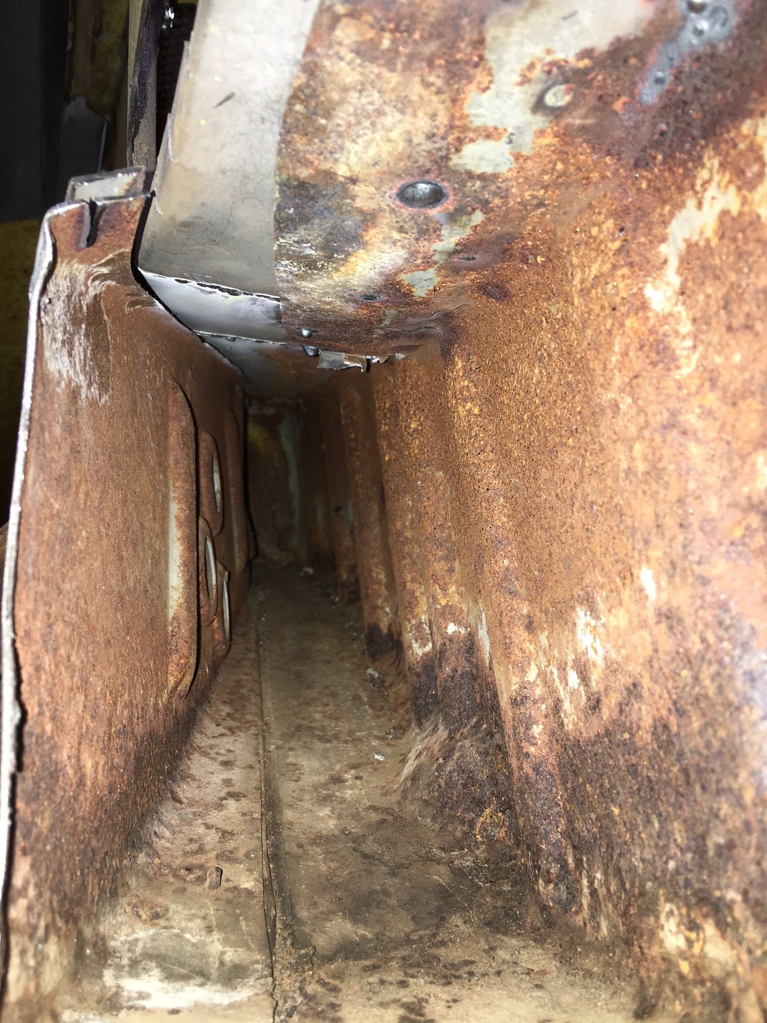 The rest of the upper long doesn't look bad from the inside. The whole long will be treated with Ospho and painted before closing it up. When cutting out the outer long I made sure to leave a section of "inner" material to tie into later for added strength. |